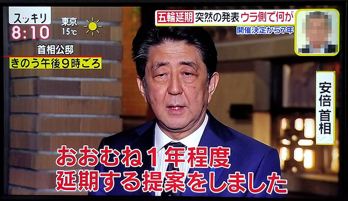 2020년 3얼 24일 오후 9시경, 일본 총리가 도쿄 올림픽을 1년 연기한다고 발표했습니다.