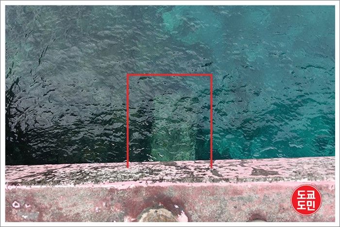 다리 밑에 직사각형의 무언가가 바닷속에 잠겨있습니다.