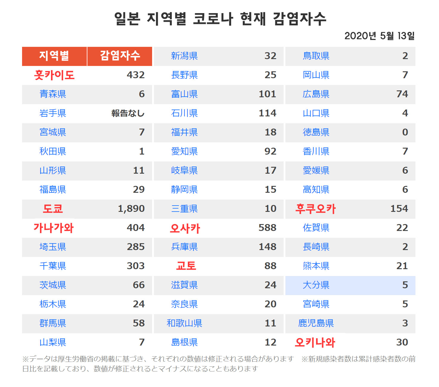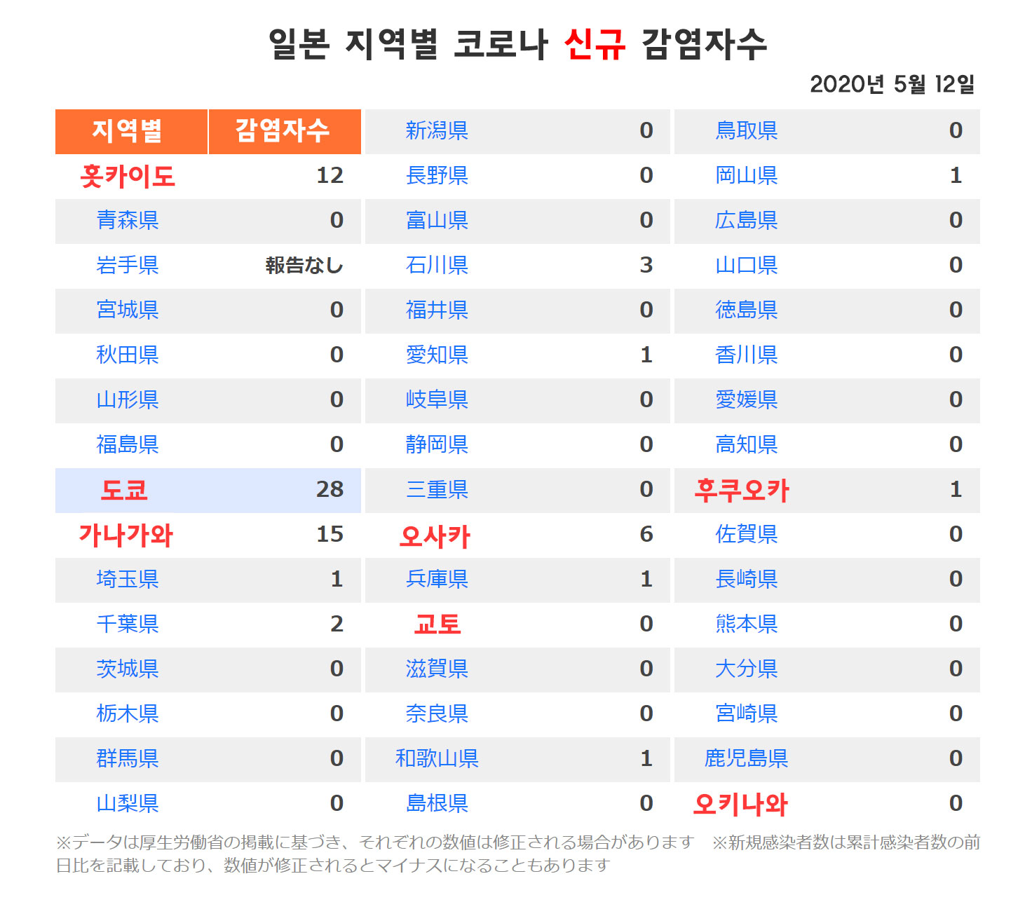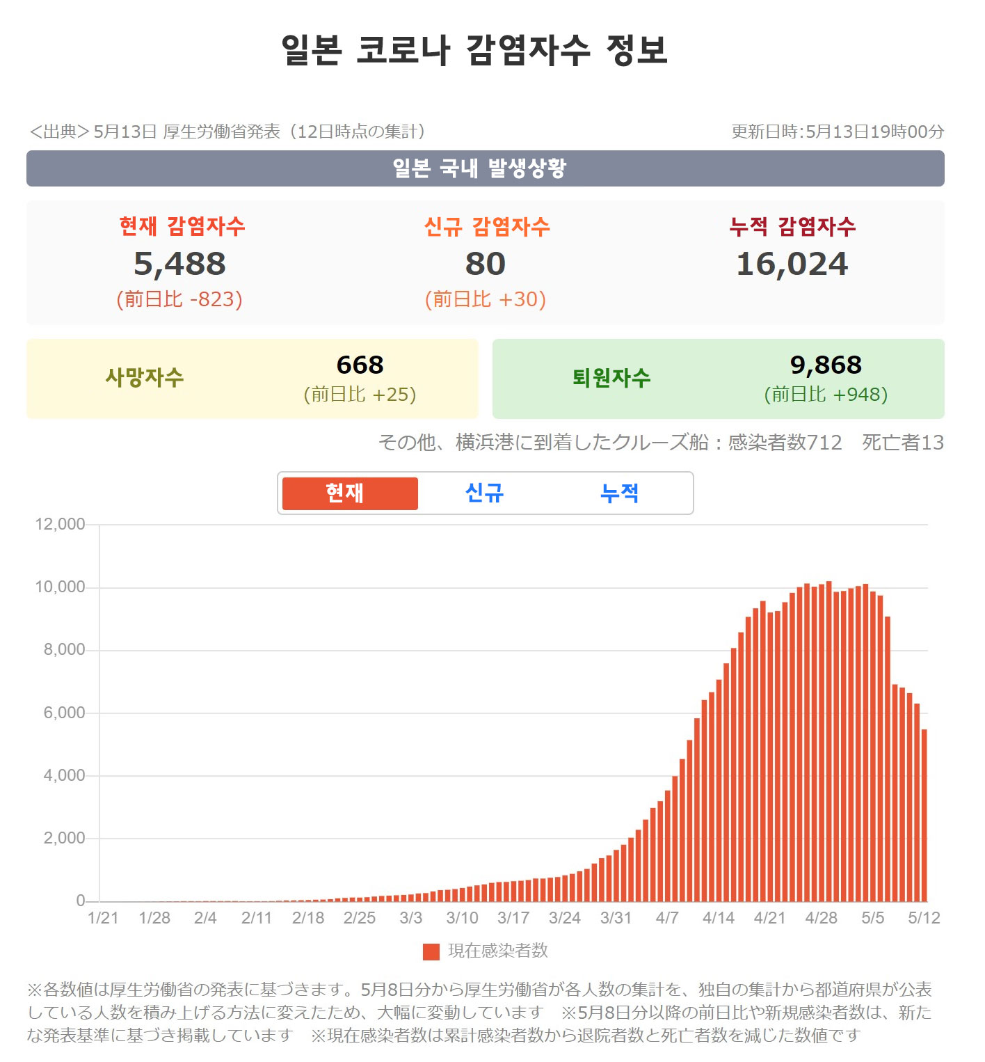 일본의 코로나 확진자수(감염자수)의 2020년 5월 12~13일자 정보를 공유합니다.