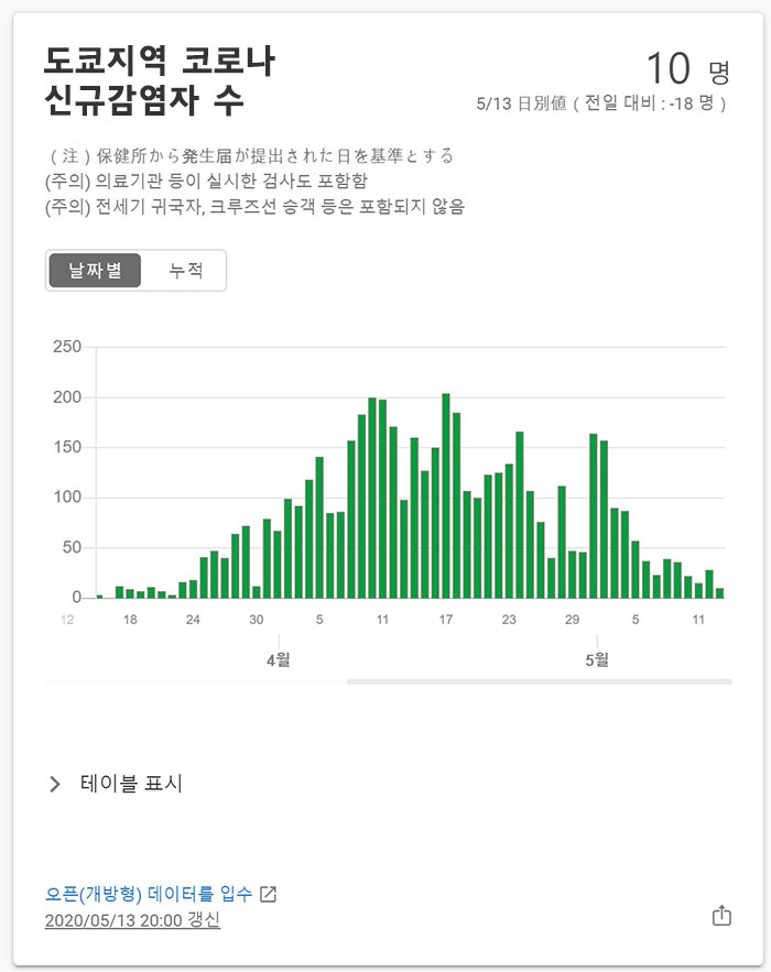 5/13일자 도쿄의 코로나 신규 감염자수는 10명입니다.
