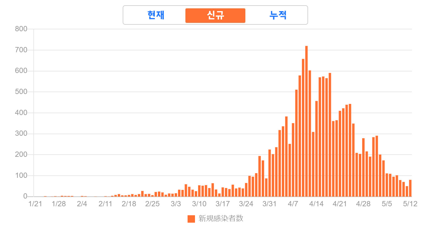 일본은 신규 확진자수가 5/12에는 80명으로 100명이하로 내려갔습니다.