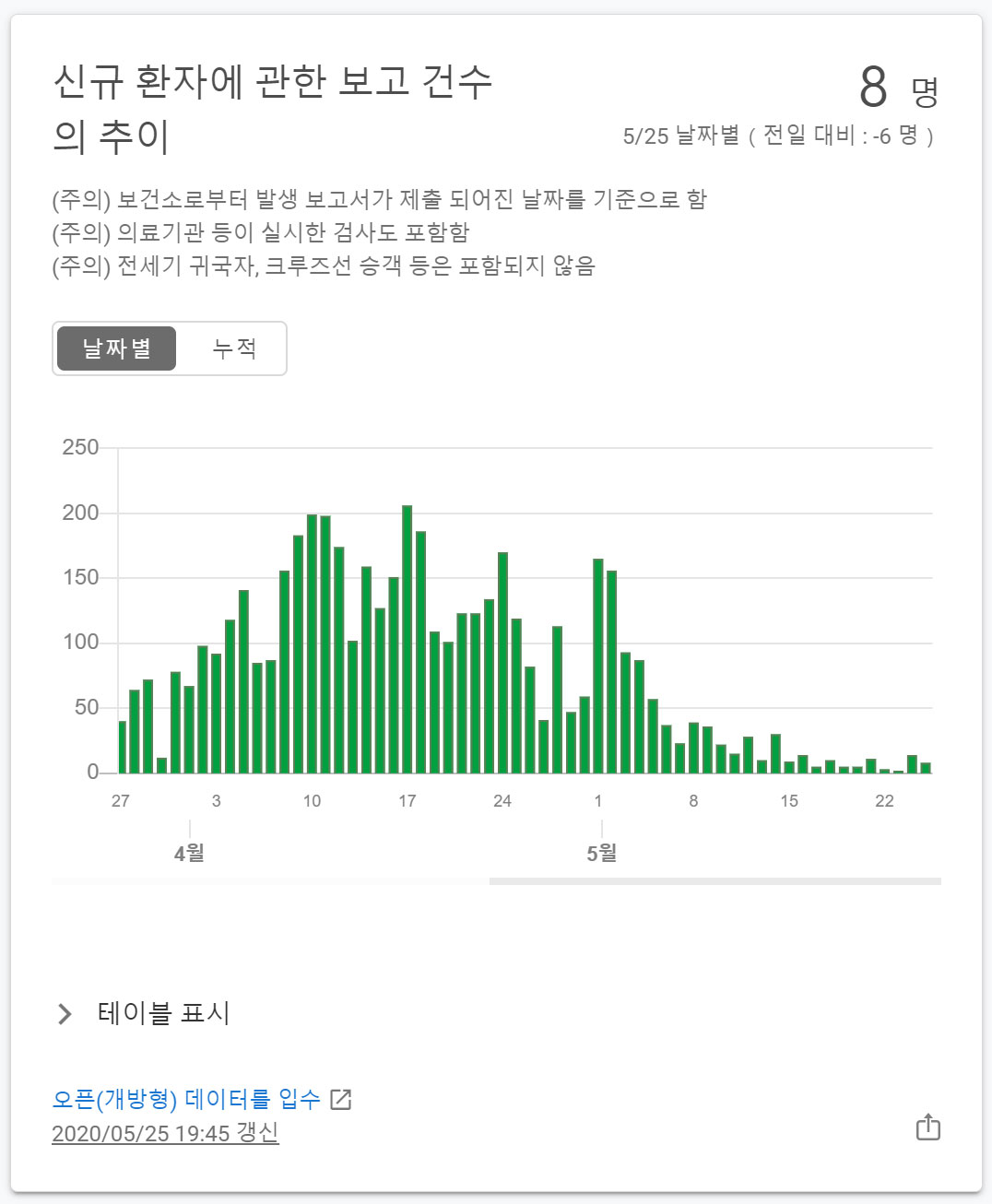 5월 25일자 도쿄의 코로나 신규 감염자수는 8명.