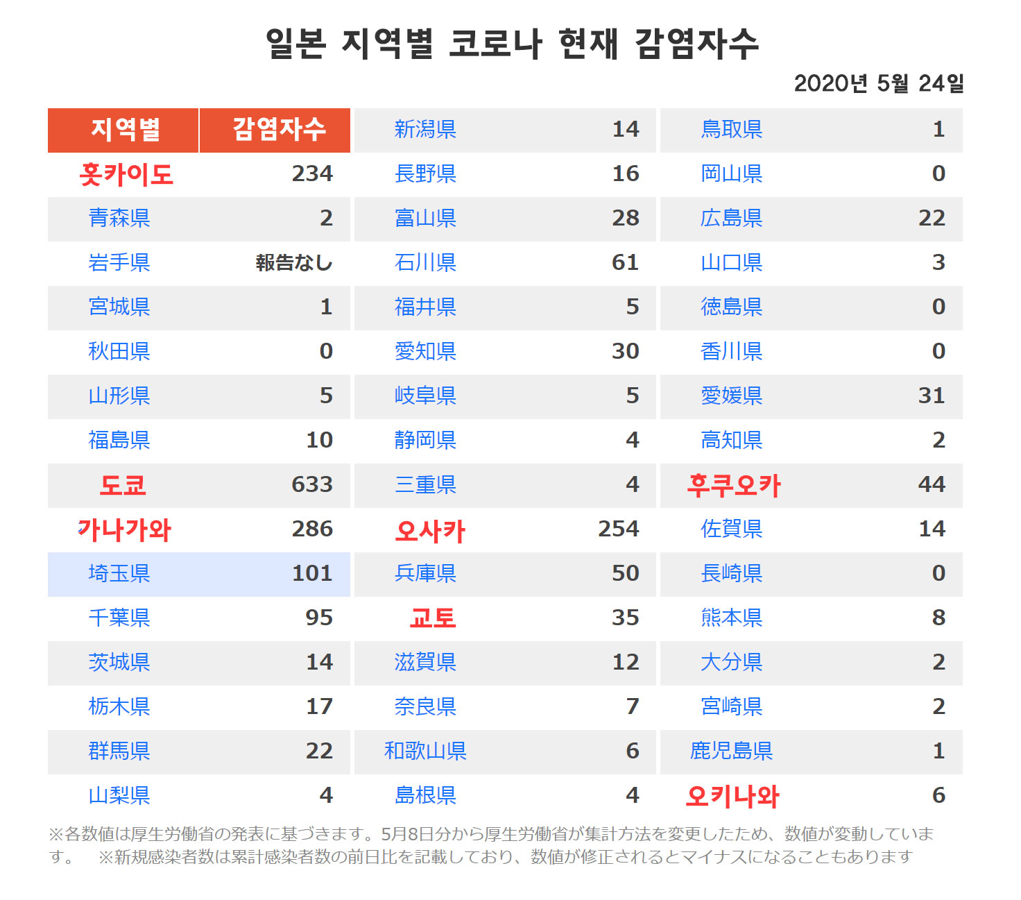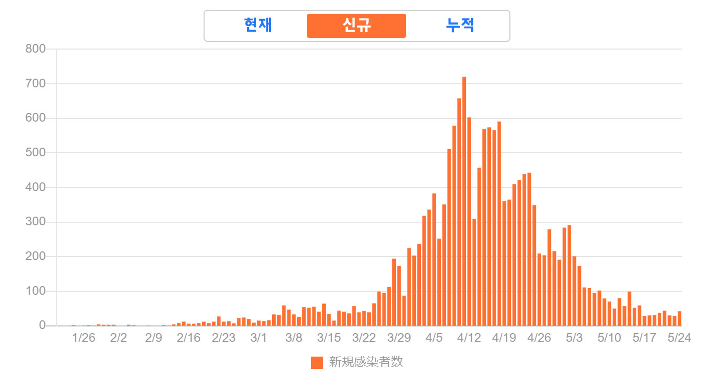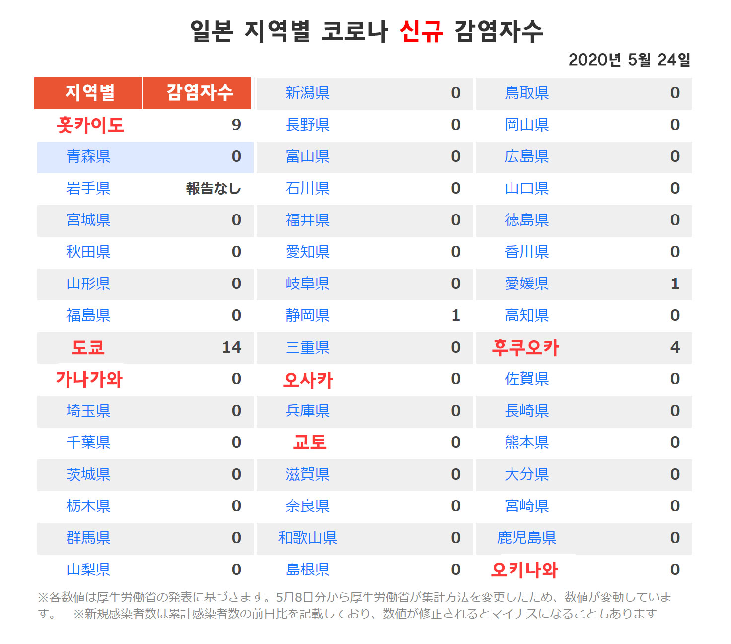 일본은 신규 확진자수가 5월 24일자로 일본 전국적으로 신규 확진자수가 42명이었습니다.