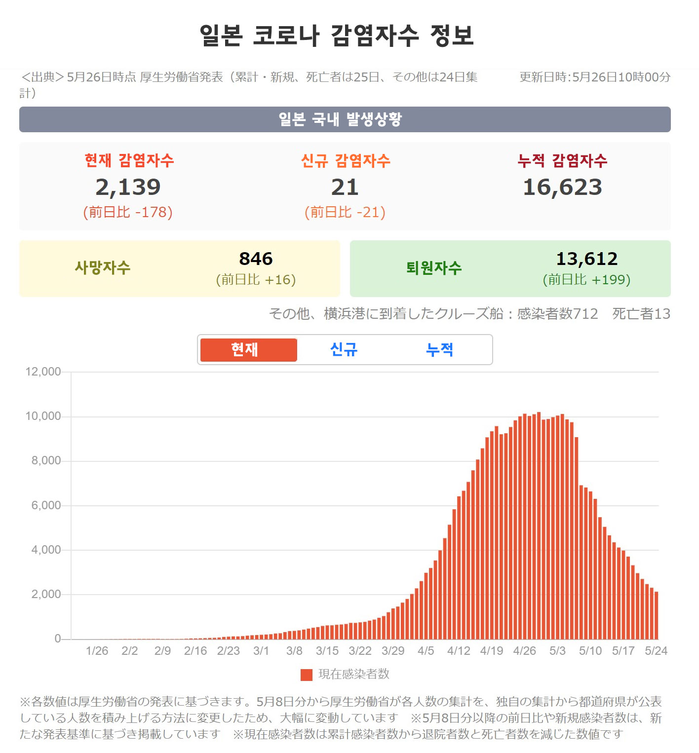 현재 감염자수도 신규 감염자수도 많이 줄었습니다.