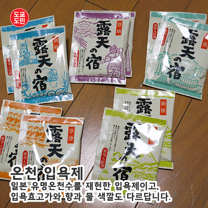 일본의 유명 온천인 벳부온천, 노보리베츠 온천, 아리마 온천, 쿠사츠온천, 하코네온천의 5종류이 온천 입욕제가 들어있씁니다.