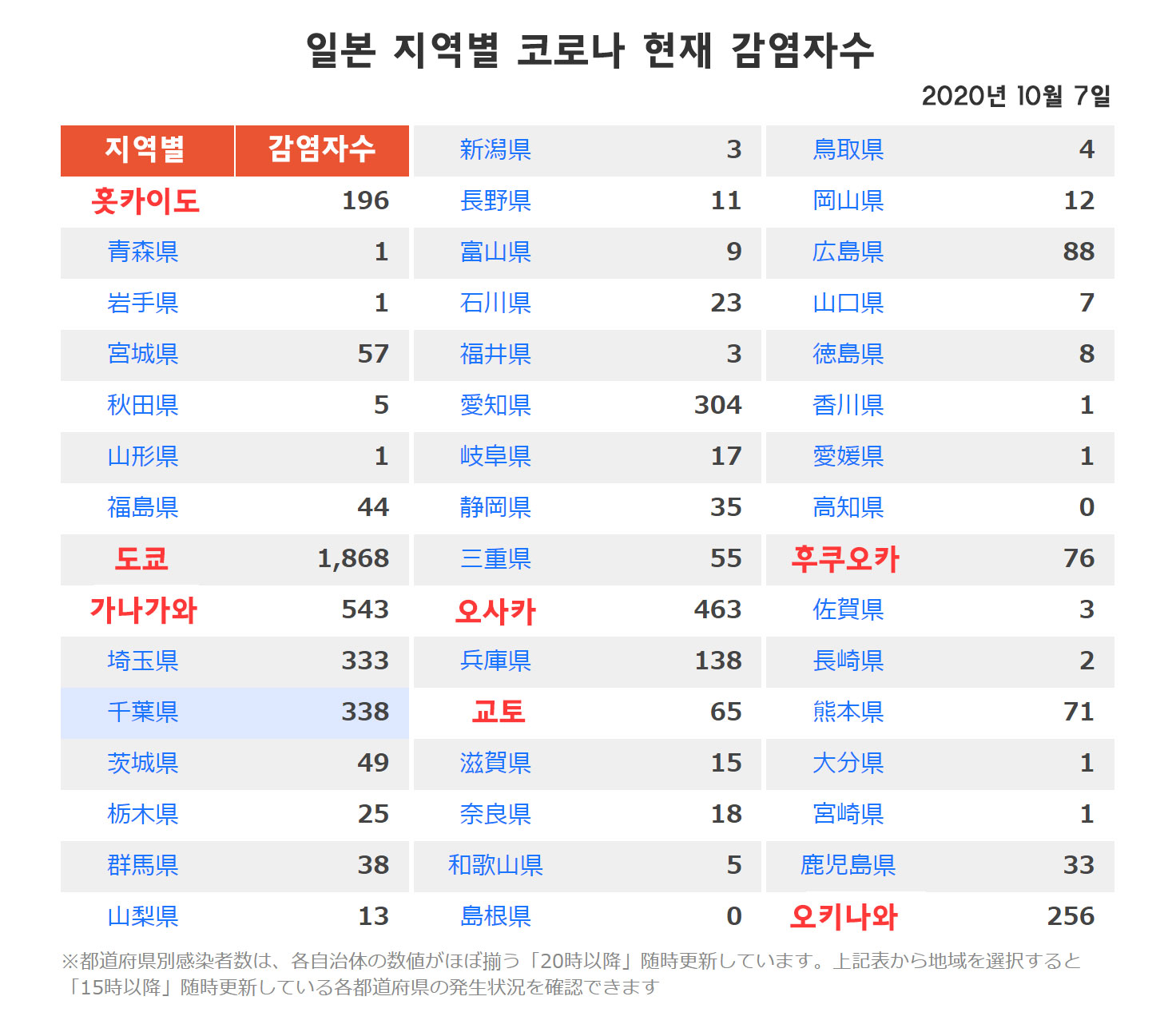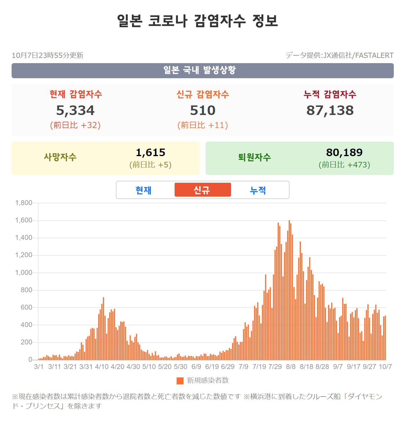 일본의 코로나 확진자수(감염자수)의 2020년 10월 7일자 정보를 공유합니다.