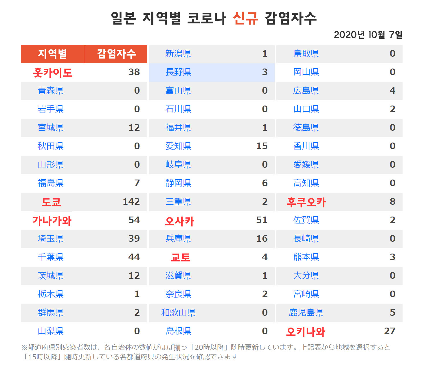 일본 지역별 코로나 신규 감염자수 (2020년 10월 7일 시점)