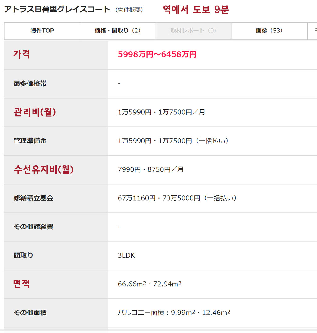 가격이 그나마 저렴한곳이 오른쪽 윗쪽에 있는 4600만엔(약 4억 6000만원)정도인 아다치구 라는 지역입니다.