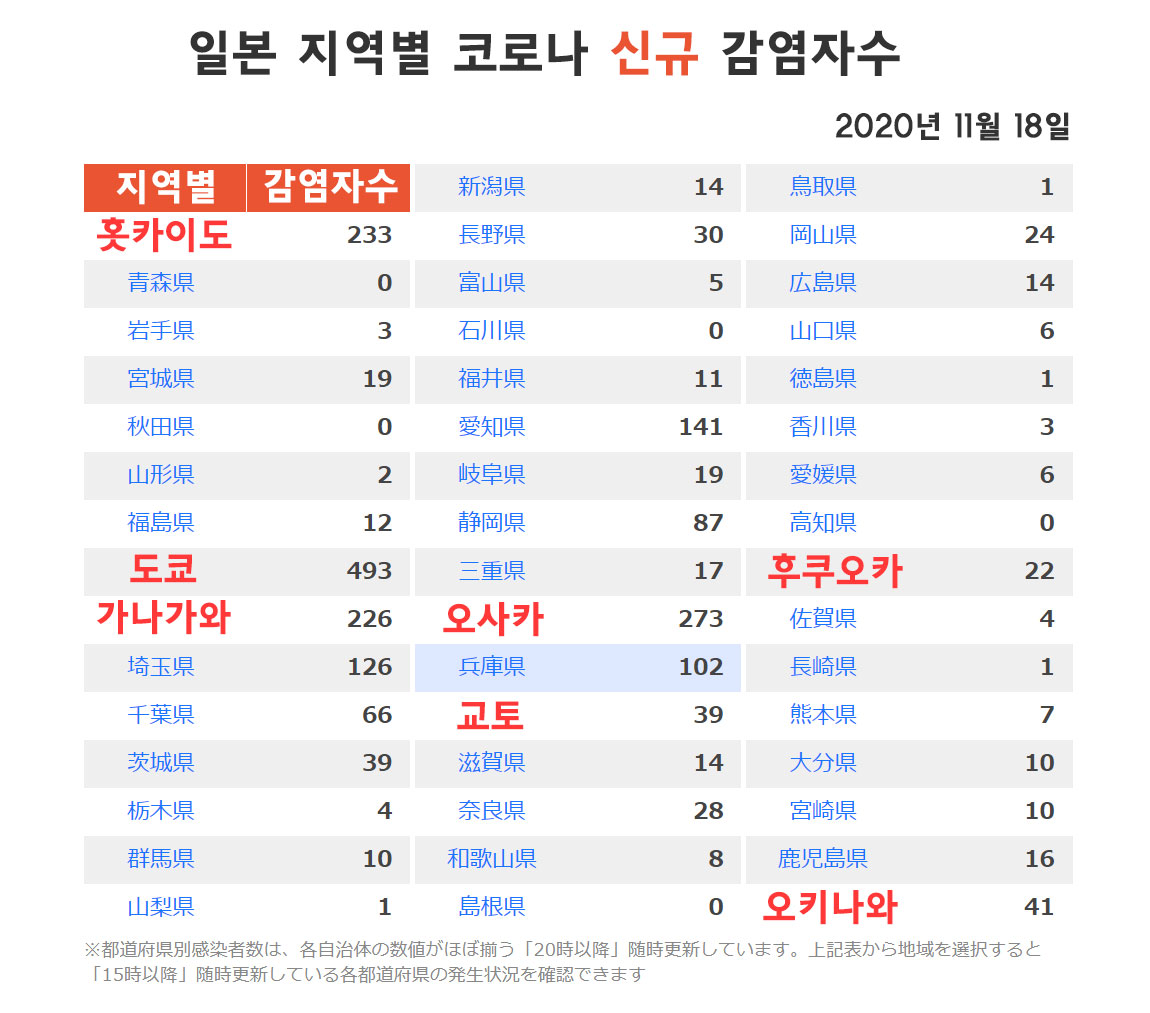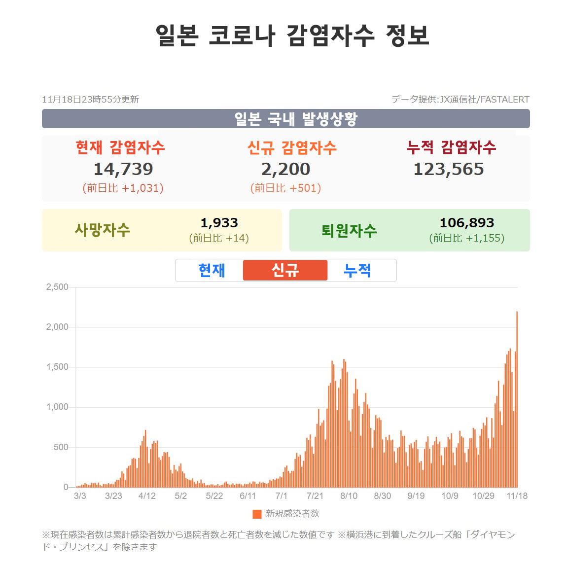 일본의 코로나 확진자수(감염자수)의 2020년 11월 18일자 정보를 공유합니다.