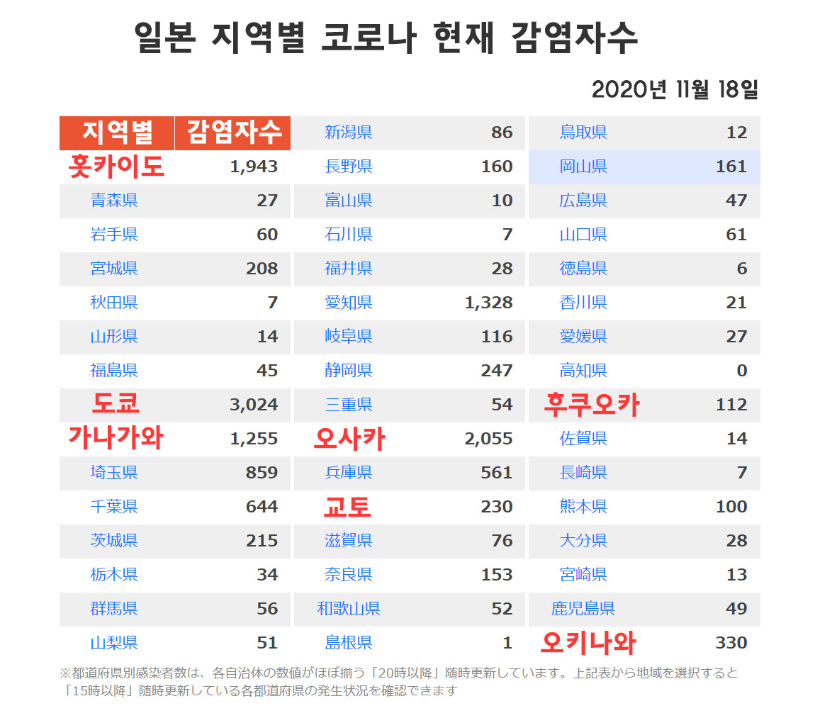 일본의 코로나 확진자수(감염자수)의 2020년 11월 18일자 정보를 공유합니다.