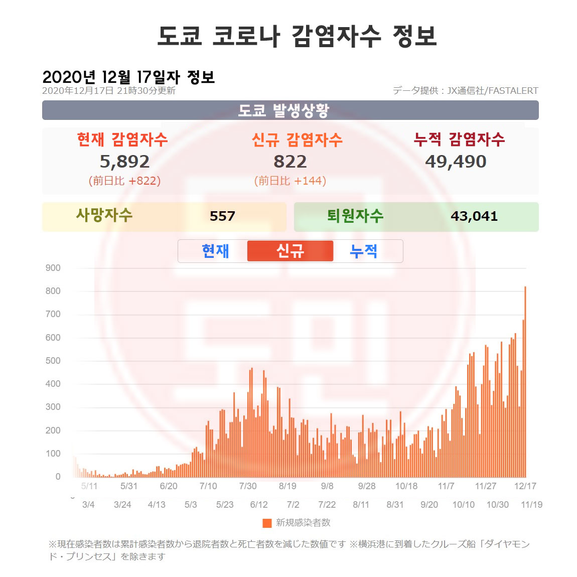 2020년 12월 17일자 도쿄 코로나 신규 감염자수는 822명!