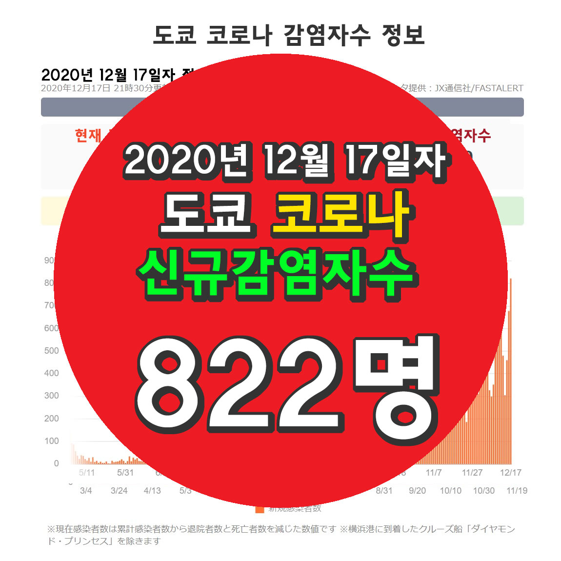 2020년 12월 17일자 도쿄 코로나 신규 감염자수는 822명!
