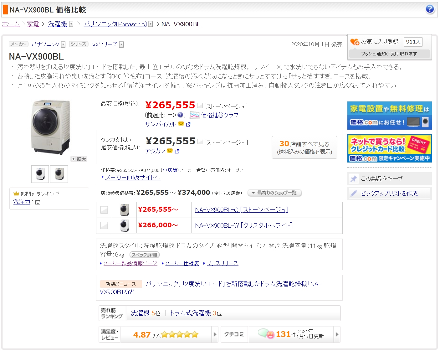 우리나라의 다나와 같은 가가쿠닷컴이라는 가격비교 사이트에서 최저가가 265,555엔(약 265만원).