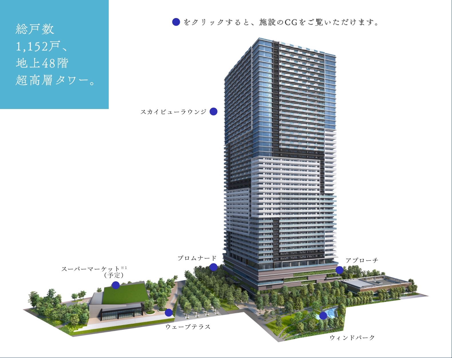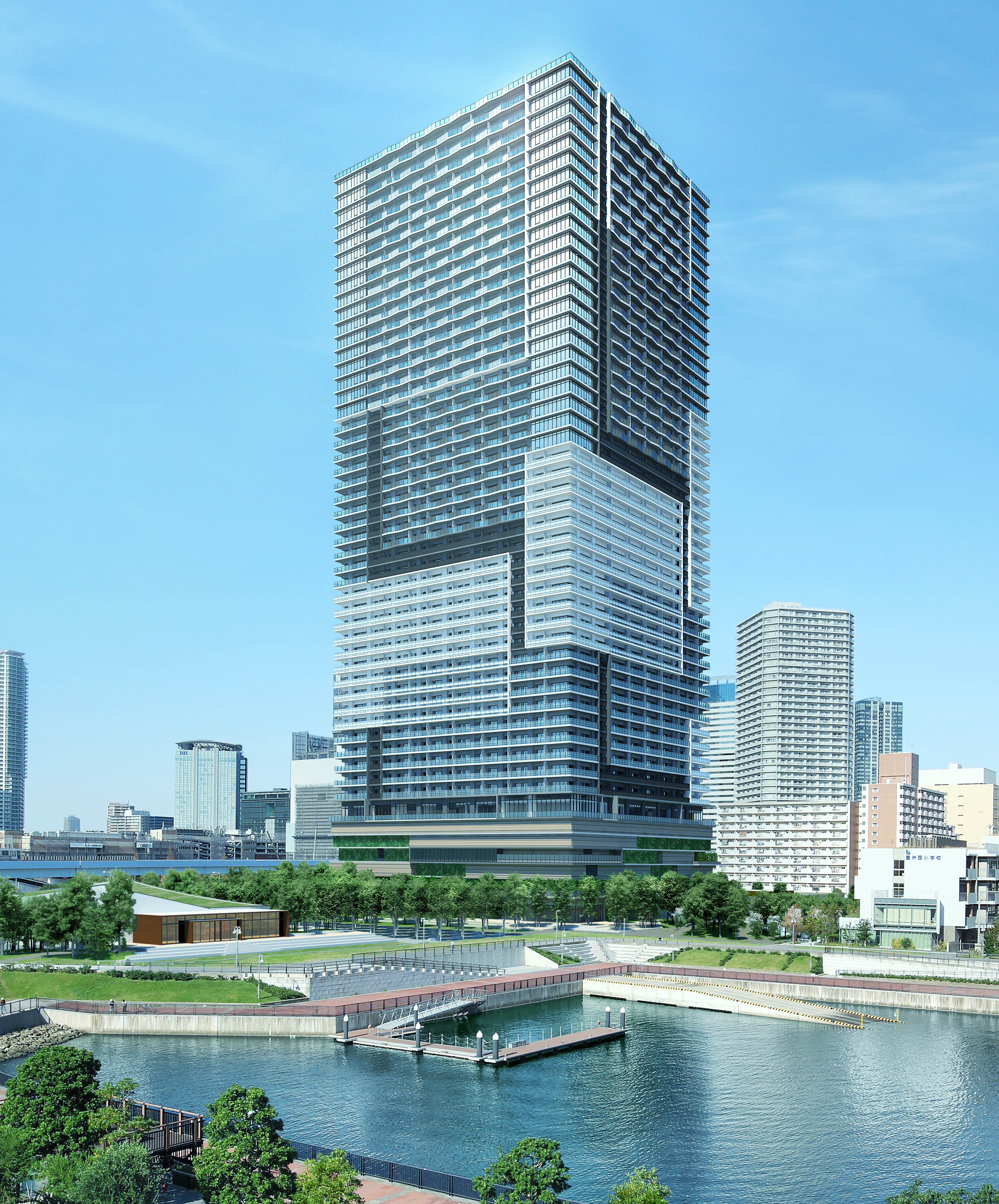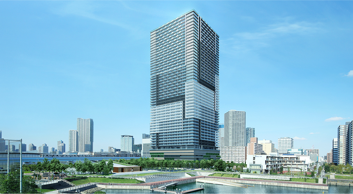 토요스역에서 걸어서 4분인 거리에 바다 앞에 짓고 있는 전망이 좋은 48층 초고층 타워맨션 "브란즈타워 토요스".