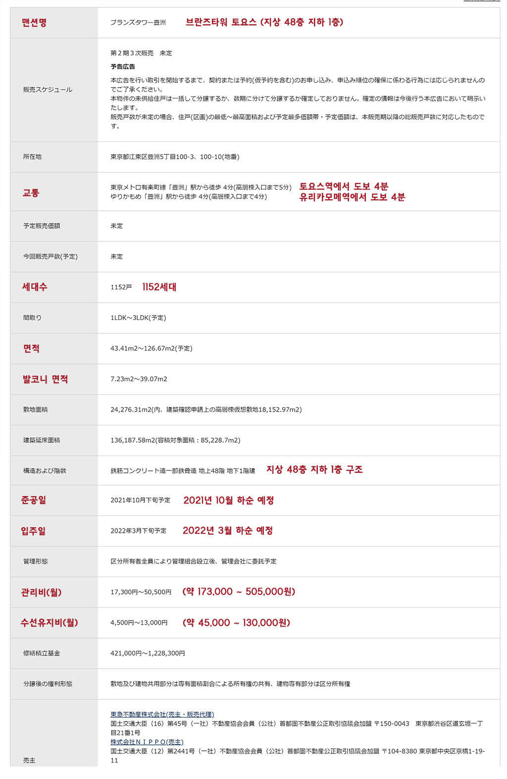 토요스의 마지막 타워맨션이라고 해도 과언이 아닐만큼 큰 인기를 얻고 있는 48층 초고층 타워맨션 "브란즈타워 토요스"에 대한 이야기와 가격에 대해 알려드리겠습니다.