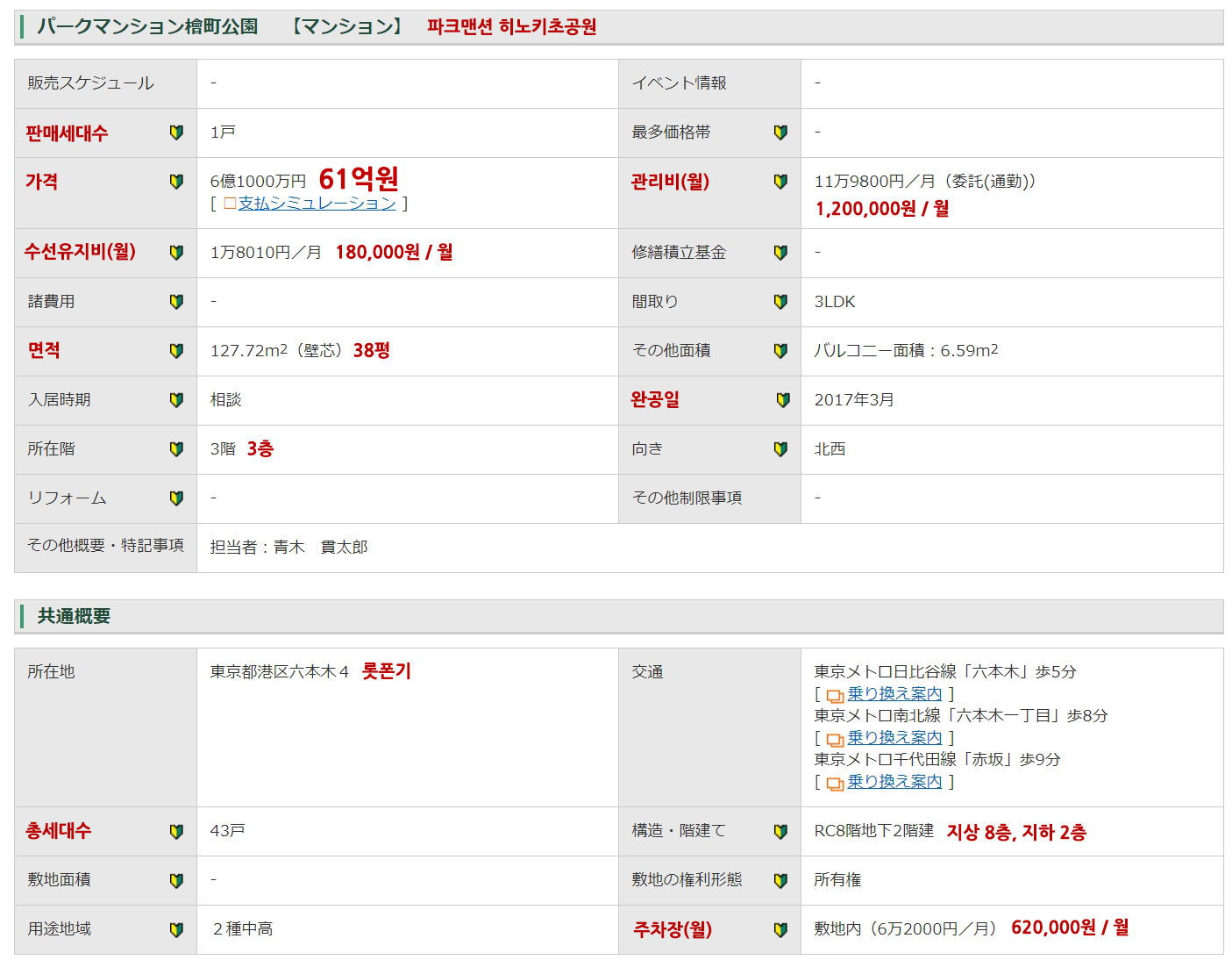 "파크맨션 히노키초공원(パークマンション檜町公園)"의 38평 중고 가격은?