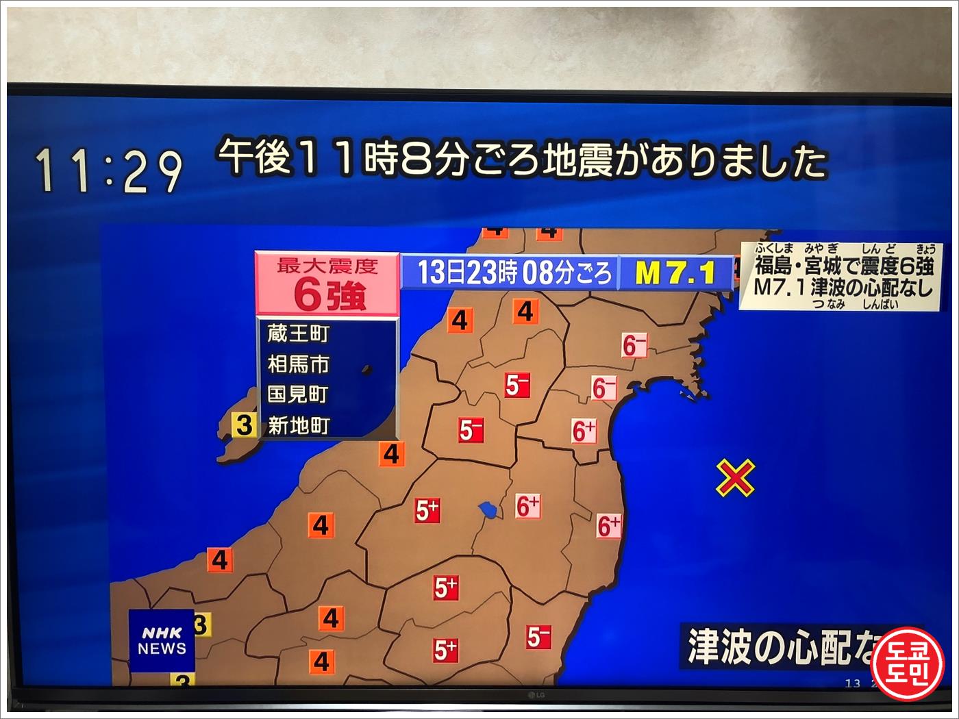 후쿠시마 주변에서 진도6강으로 가장 강했고, 그로 인해 도쿄는 진도4로 흔들렸습니다.