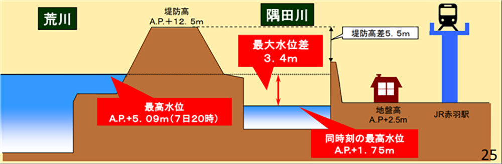 제일 왼쪽에 있는 "아라카와" 라는 강의 수위와 오른쪽에 집의 위치를 비교해보면 아시겠지만, 집이 있는 곳이 강의 수위보다 낮은 곳에 있습니다.