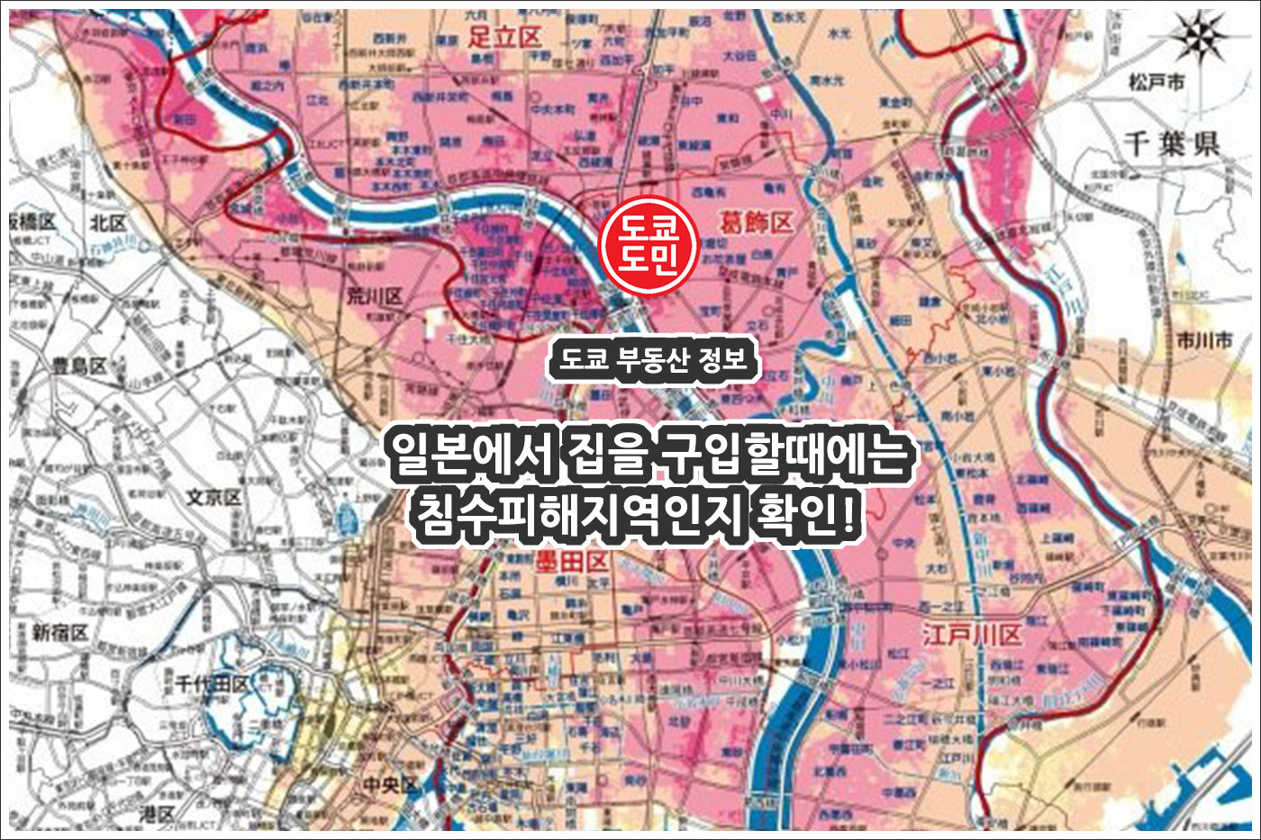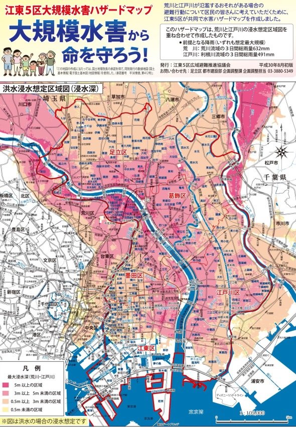 도쿄 수해피해지역으로 하자드맵에 진한 빨간색으로 표시된 지역입니다.
