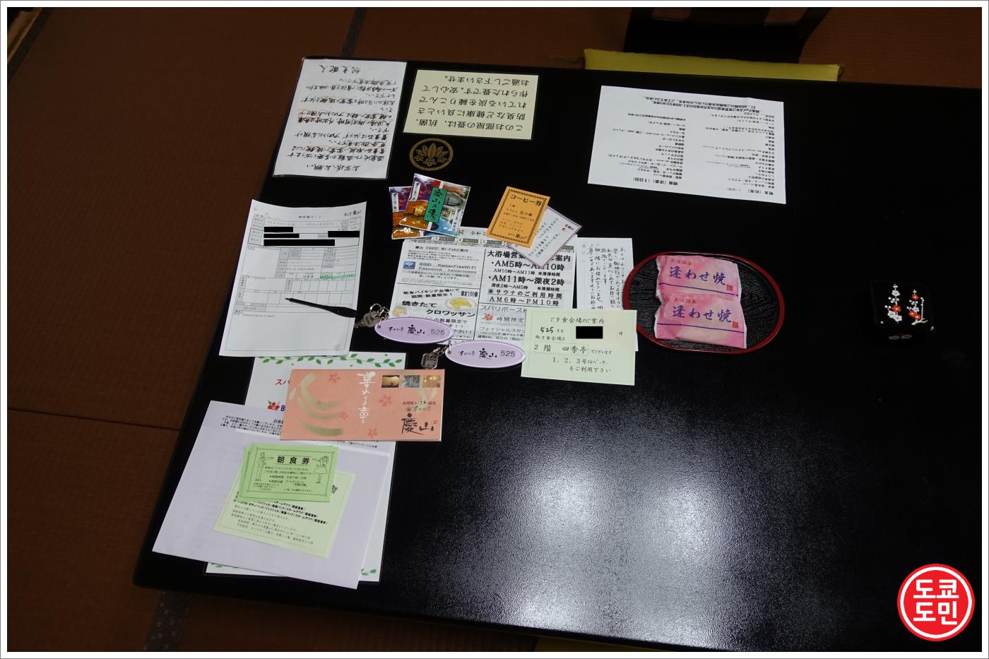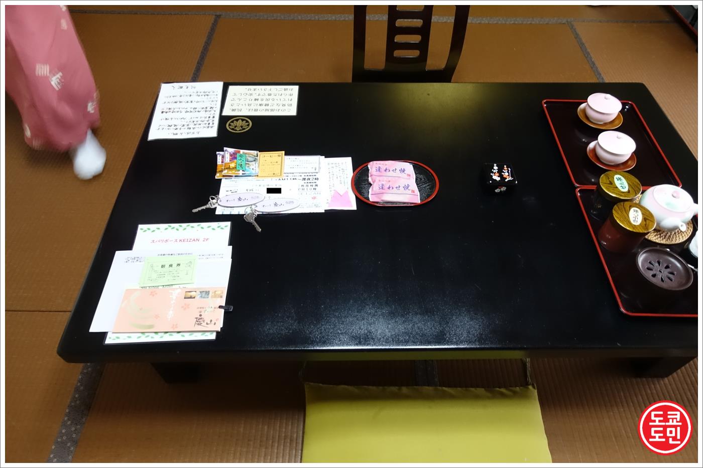 방은 다다미로 되어 있고, 중앙에 놓여있는 큰 테이블에는 차, 간단한 과자, 안내문등이 있었습니다.