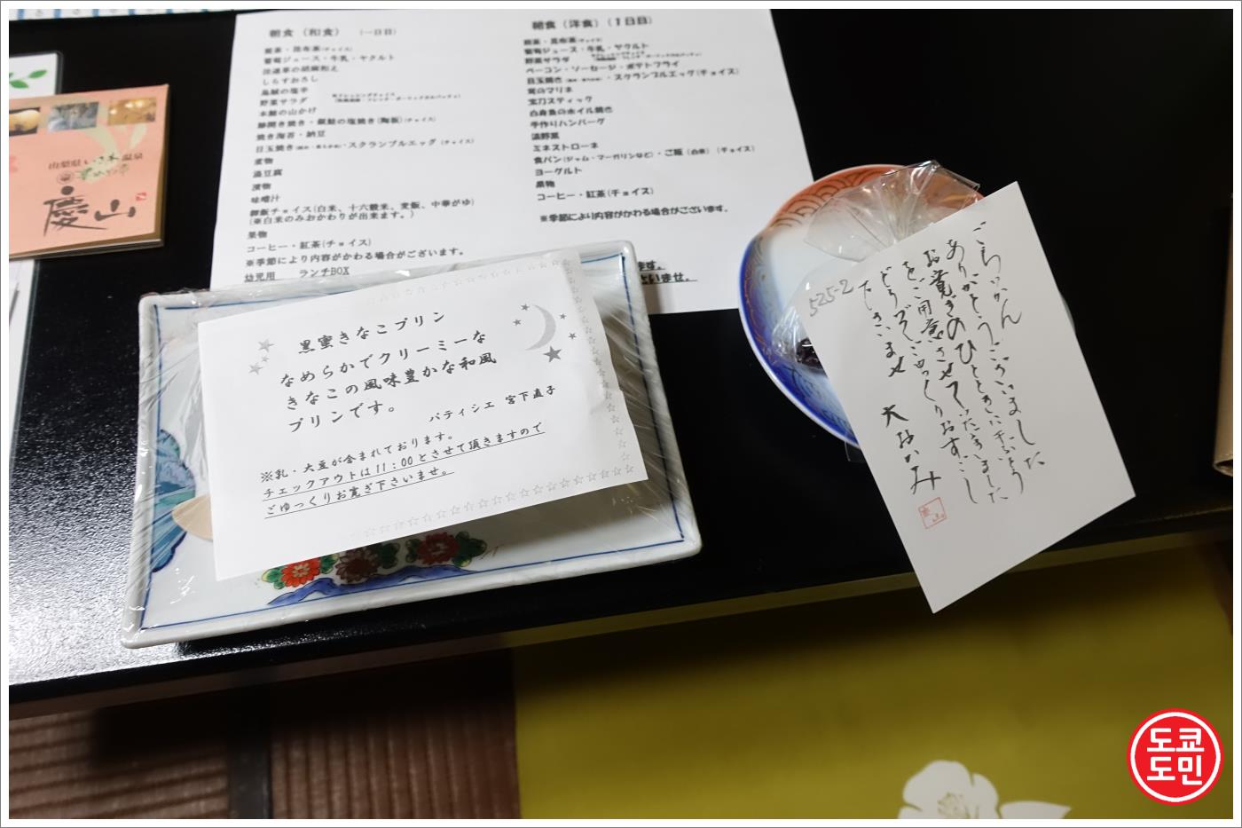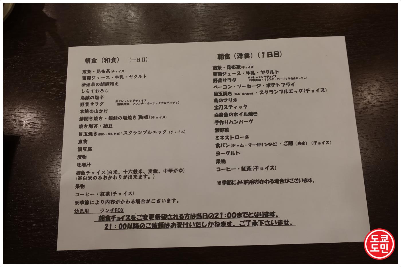 저녁식사 안내, 조식 안내, 온천시설 이용안내등에 대해 안내되어 있는 종이가 있습니다.
