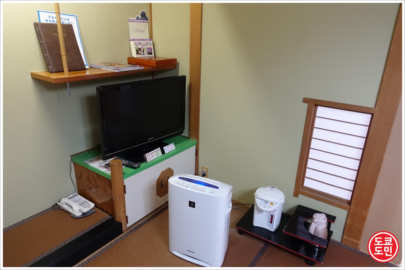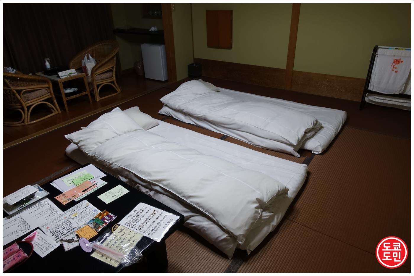 방은 다다미로 되어 있고, 중앙에 놓여있는 큰 테이블에는 차, 간단한 과자, 안내문등이 있었습니다.