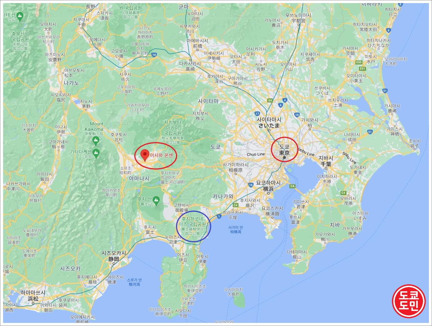 이사와온천은 도쿄 신주쿠에서 전철로 1시간 30분거리에 있어서 하코네온천 가는것과 그렇게 차이가 나지 않습니다.