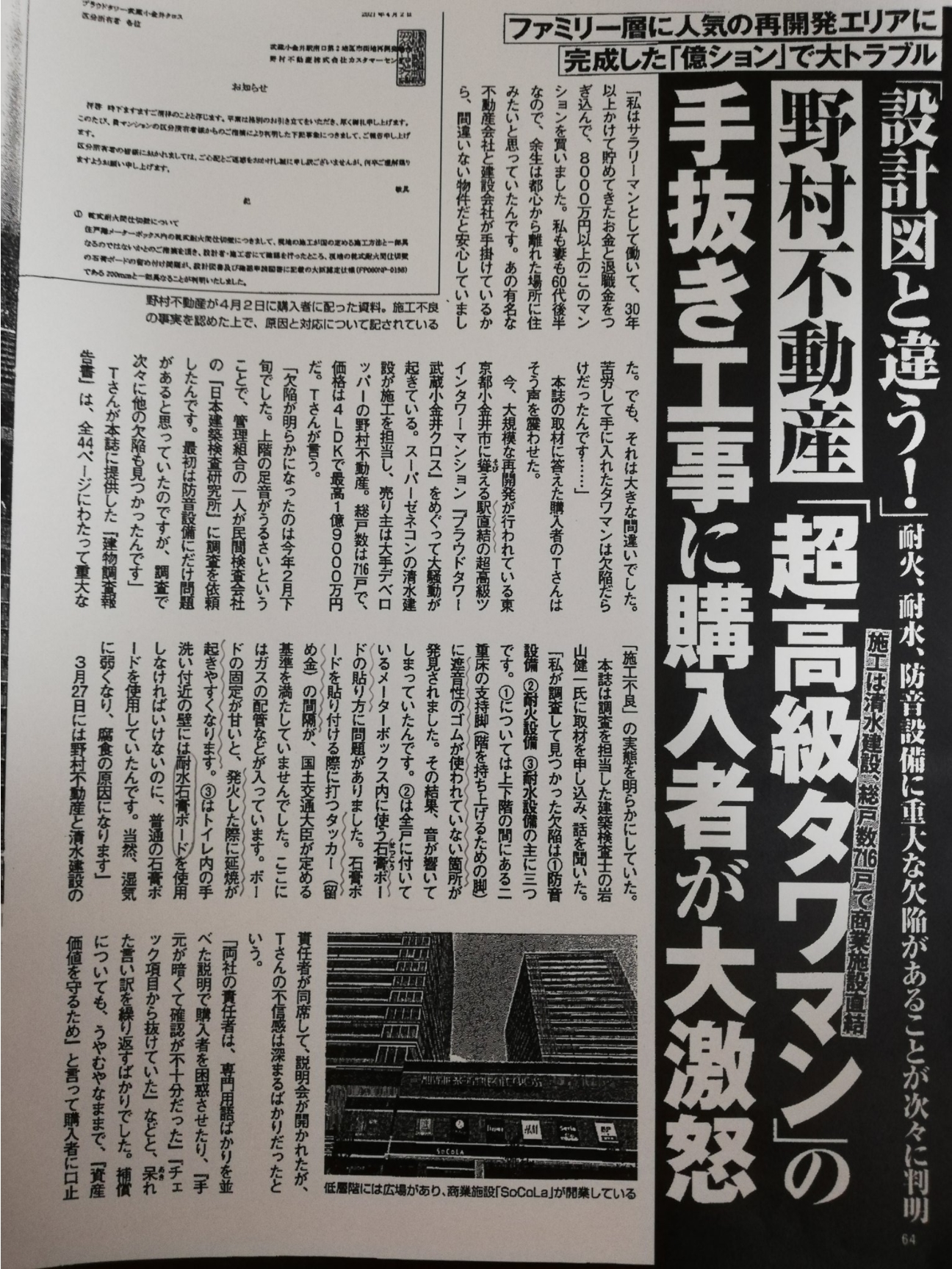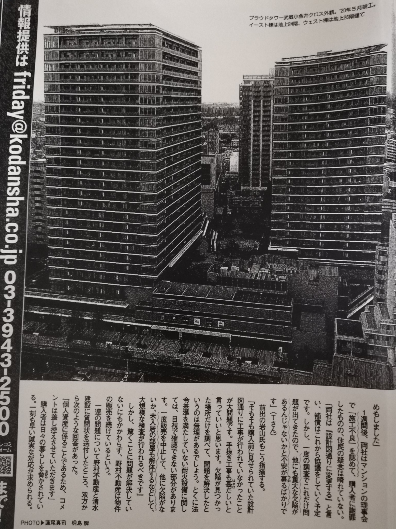 2021년 6월 14일, 도쿄 초고급 타워맨션인 "프라우드 타워 무사시코가네이 크로스(プラウドタワー武蔵小金井クロス)"의 결함, 부실공사의 뉴스가 보도되었습니다.