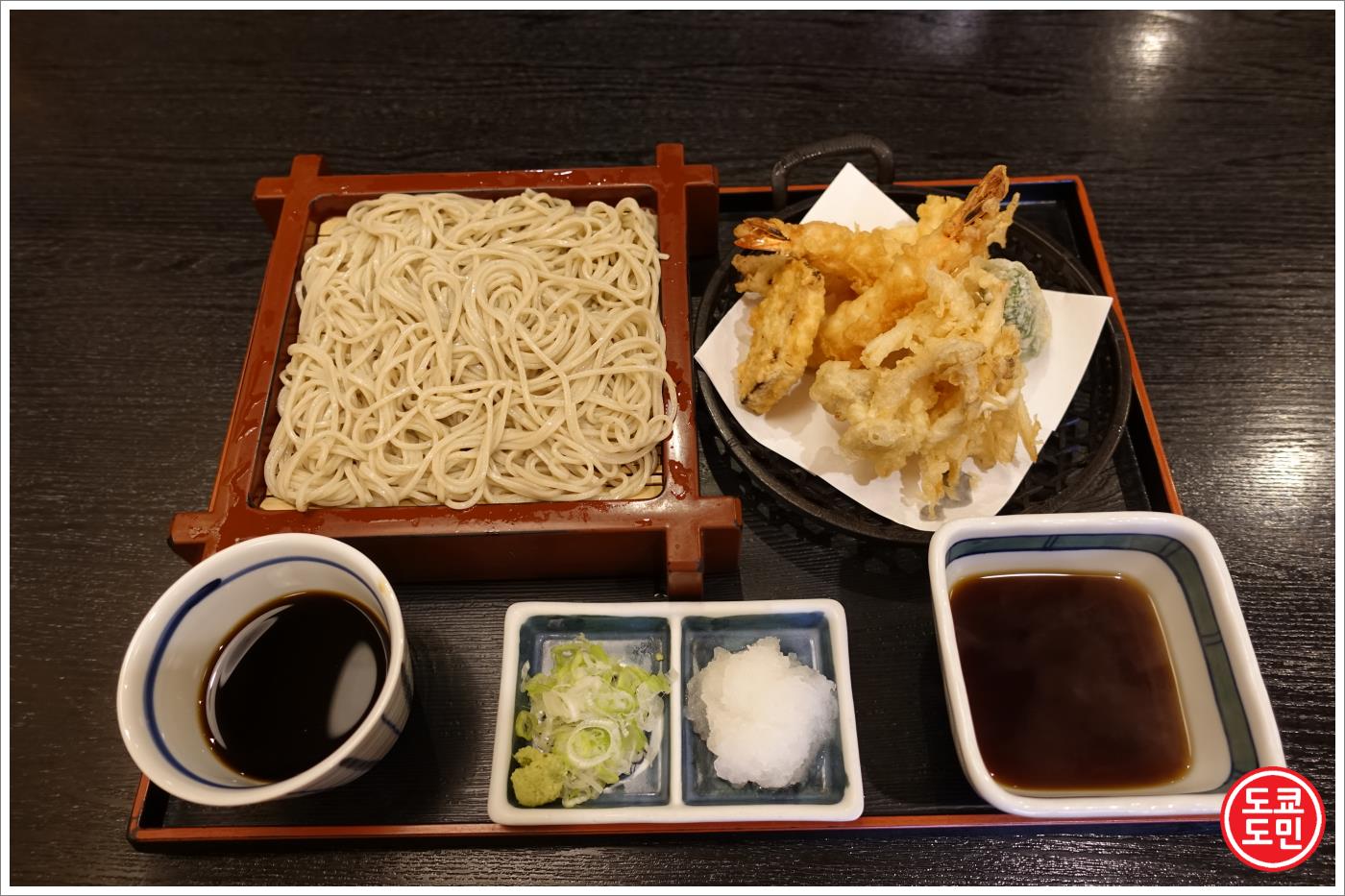 왼쪽에 동그란 그릇에 들어있는 소스는 소바를 찍어먹는 소스.