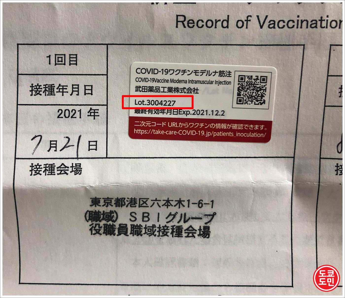 모더나백신의 경우 일본에서는 접종 후 접종일, 백신명, 로트번호가 기재되어 있는 접종증명서에서 확인할 수 있습니다.