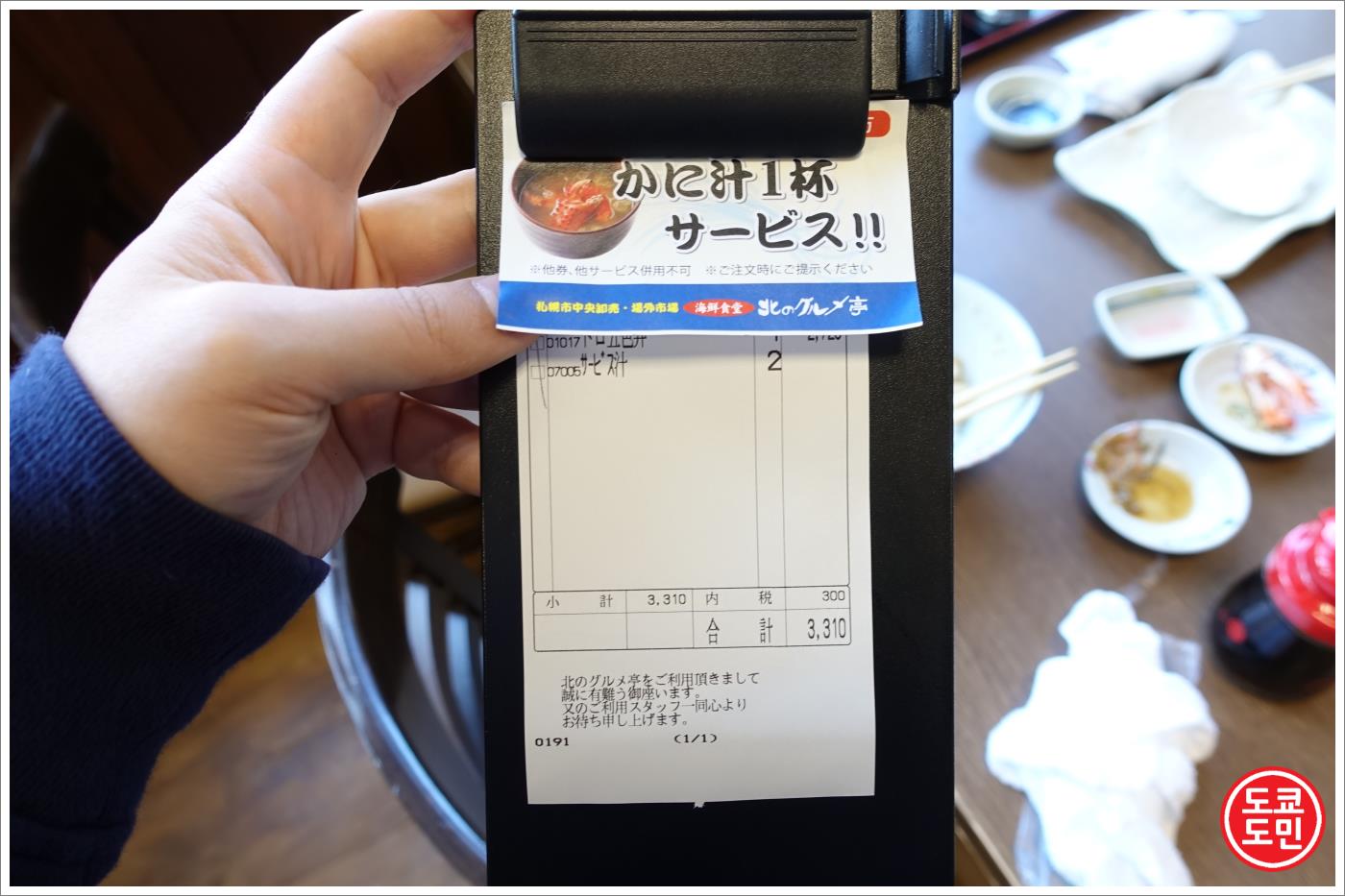 계산서에는 게가 들어있는 된장국은 서비스라는 서비스티켓이 꽂혀있었어요.