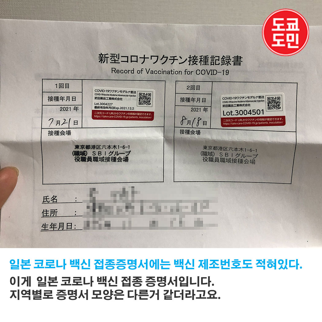 일본의 코로나 백신 증명서에는 백신의 제조번호(로트번호)가 적혀있습니다.
