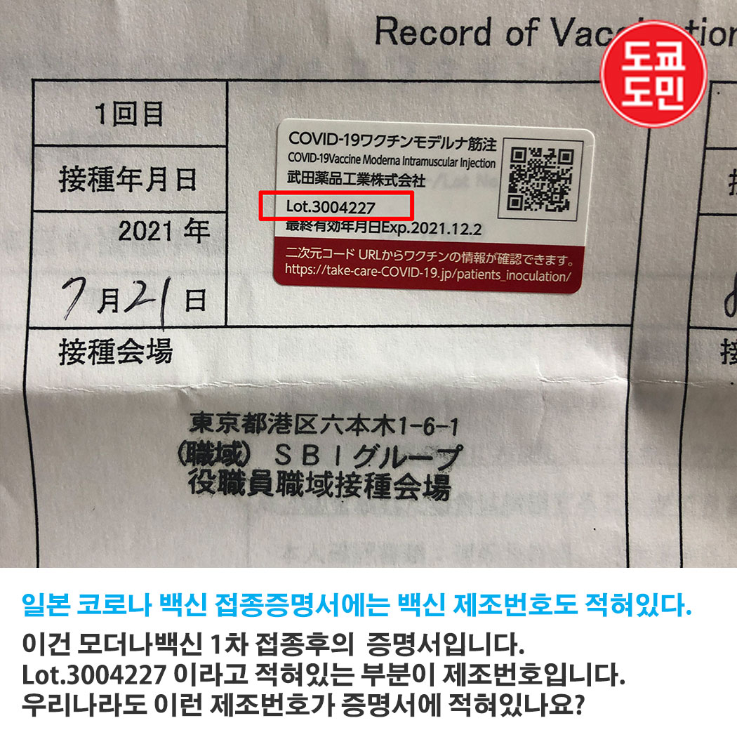 일본의 코로나 백신 증명서에는 백신의 제조번호(로트번호)가 적혀있습니다.