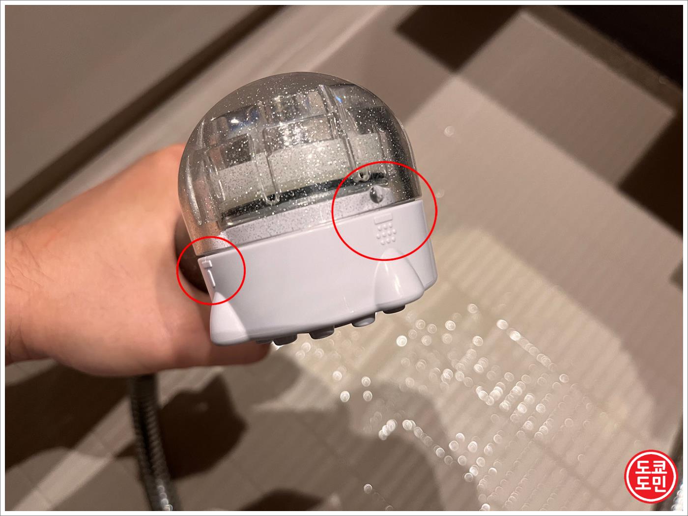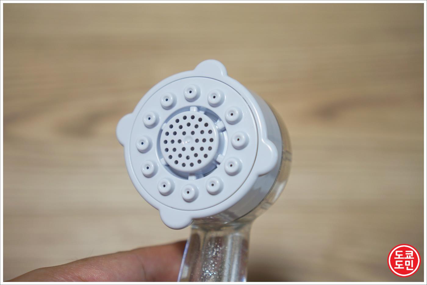 바깥쪽에 둥글게 되어있는 12개의 구멍에서는 미스트의 모드일때 물이 나오는 곳이고, 안쪽에 구멍이 모여있는 곳에서는 스트레이트 모드일때 물이 나오는 곳입니다.