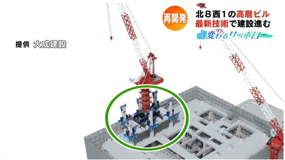 일본 최초로 적용된 건설공법은 건물 기둥에 크레인으로 올려서 크레인 자체를 건물 기둥에 따라 끌어올리는 공법이 적용되었습니다.