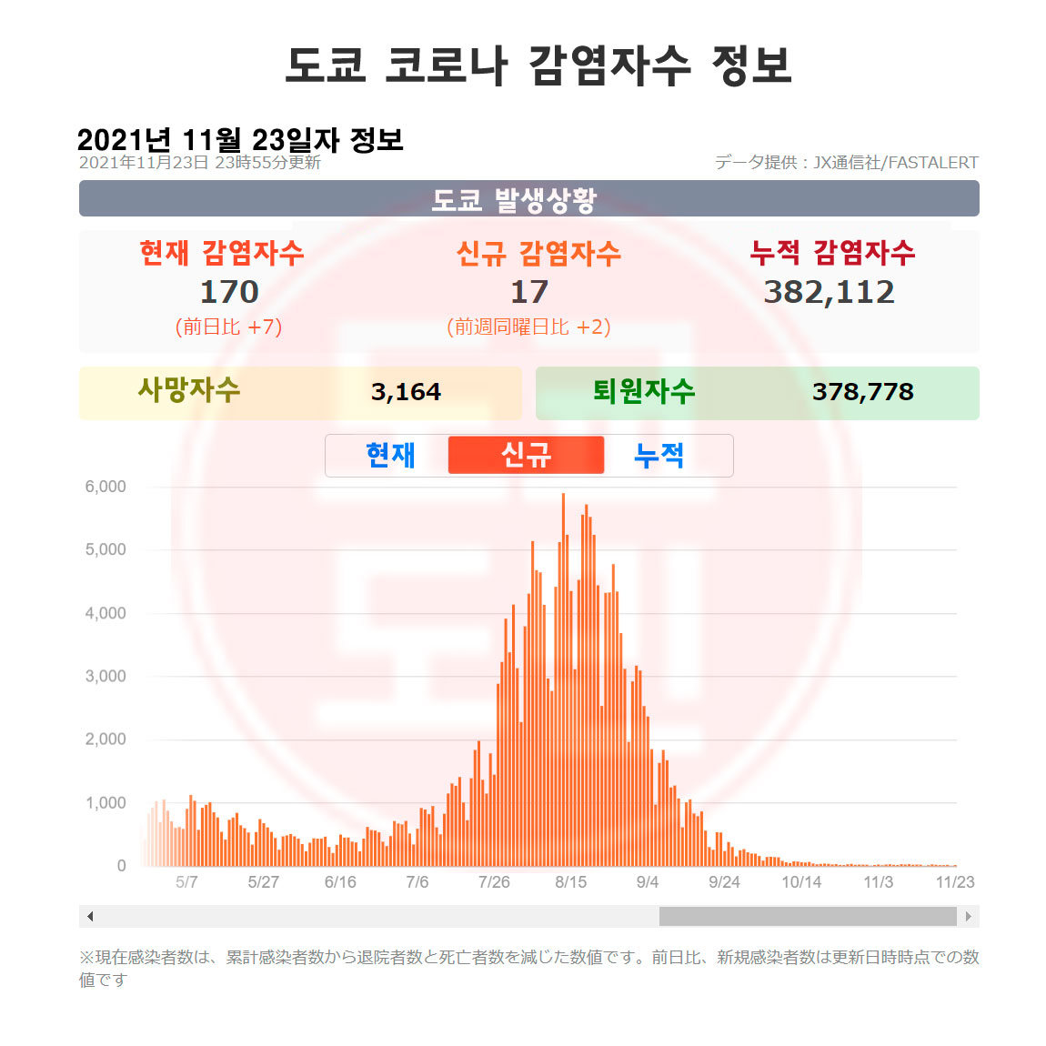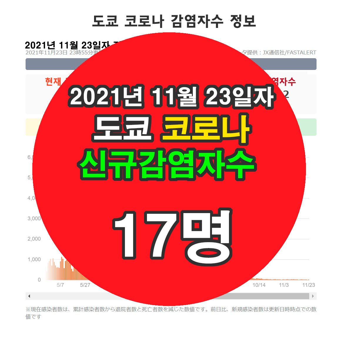 2021년 11월 23일자 도쿄 코로나 신규 확진자수 정보입니다.