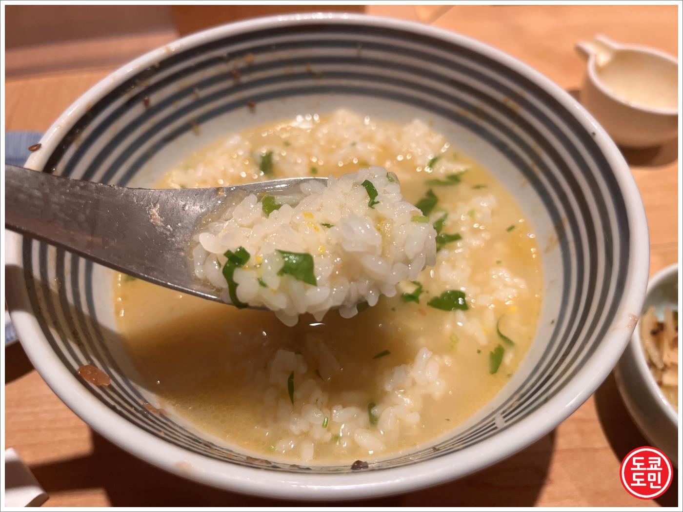 밥을 다 먹은 후 밥공기를 싹 비워도 되고 어느정도 남겨놓은 상태에서 그릇을 주면 이렇게 국물을 넣어줍니다.