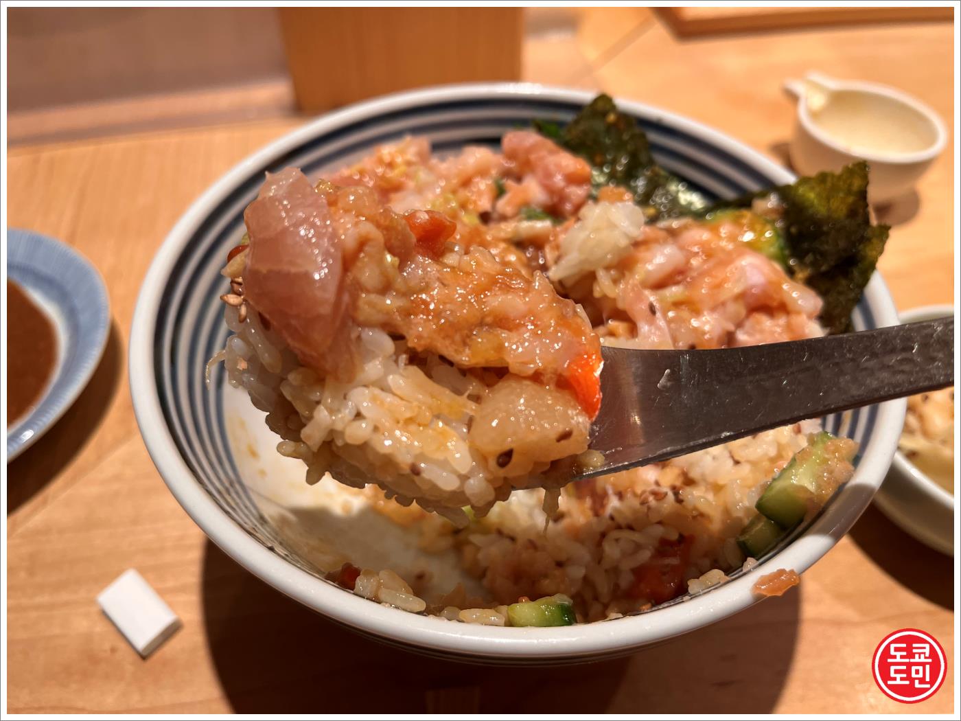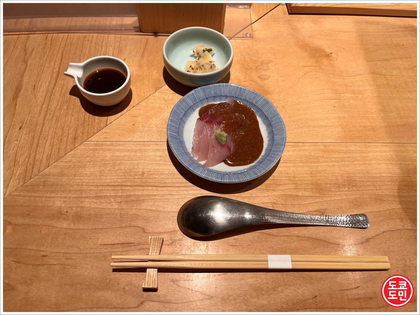 해산물덮밥에 있는 와사비를 이 간장에 넣어서 풀어줍니다.
