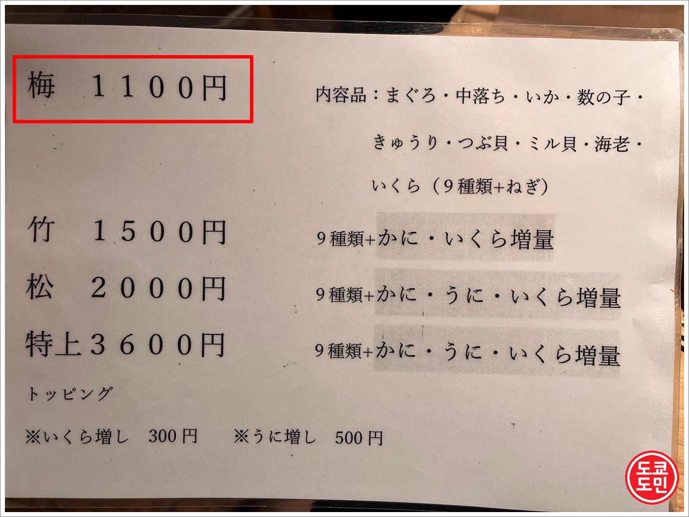 기본 베이스가 되는 1100엔짜리인 1번 메뉴인 "우메(梅)" 에 게살 추가와 연어알이 더 많이 들어가면 1500엔짜리인 2번 메뉴가 됩니다.