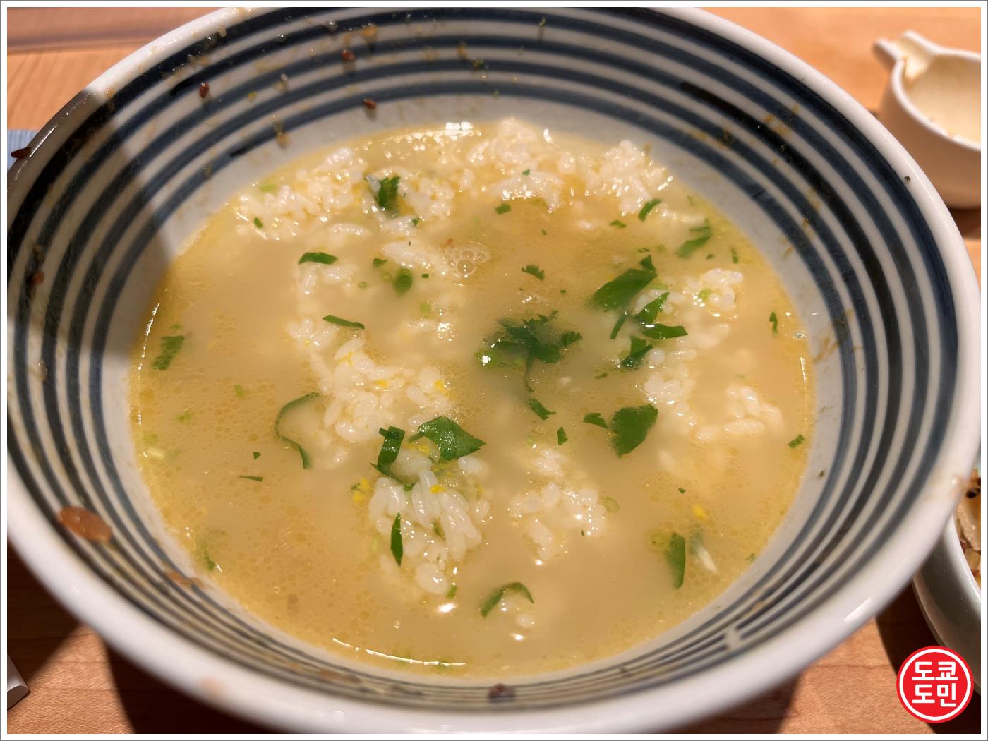 밥을 다 먹은 후 밥공기를 싹 비워도 되고 어느정도 남겨놓은 상태에서 그릇을 주면 이렇게 국물을 넣어줍니다.