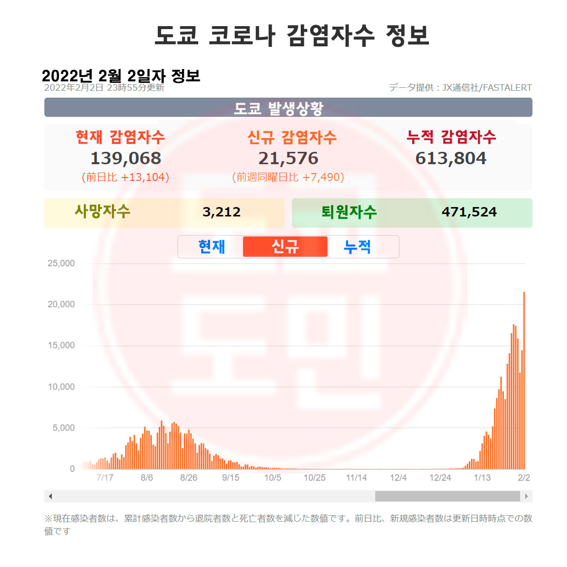 2022년 2월 2일자 도쿄 코로나 신규 확진자수 정보입니다.