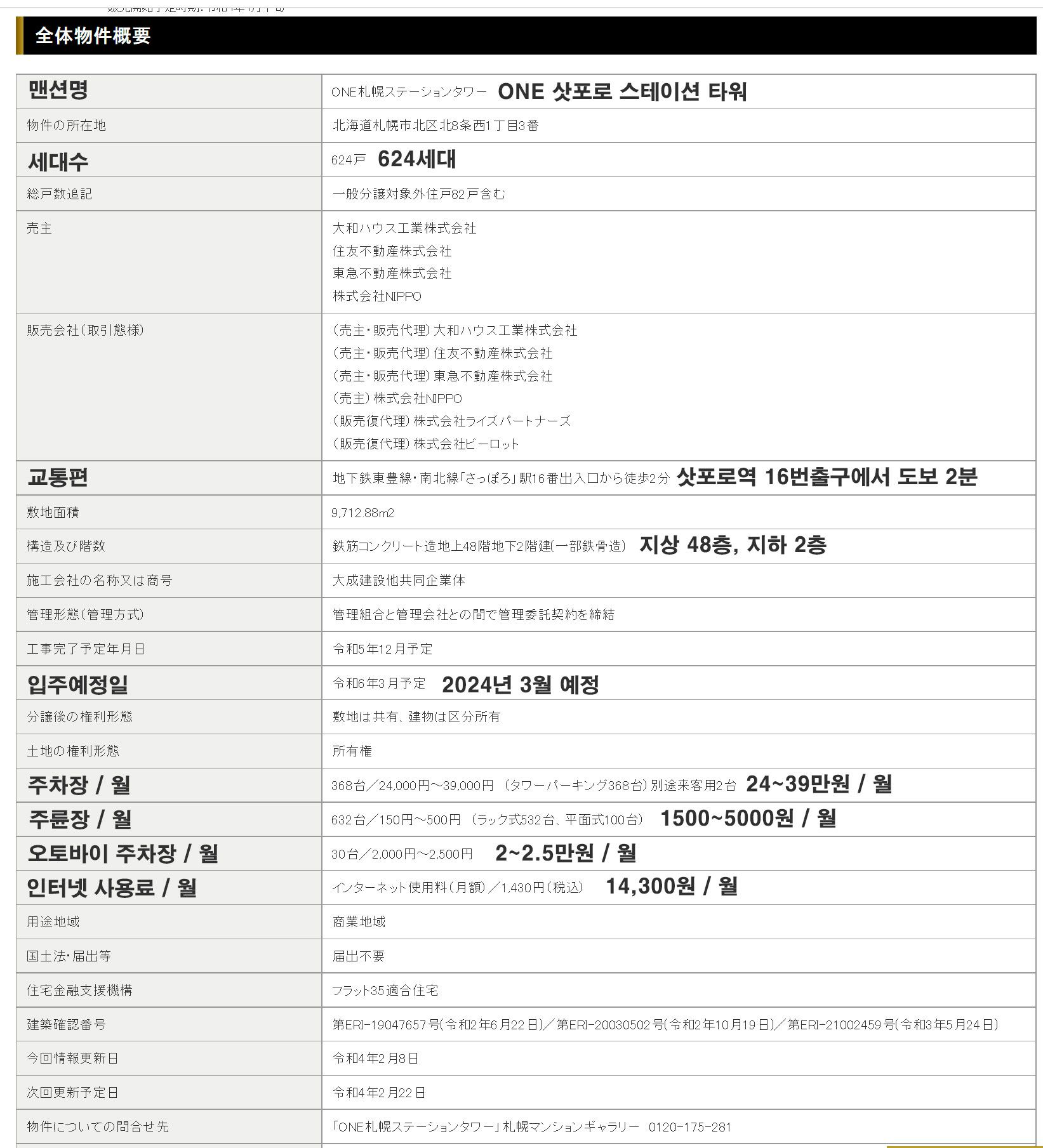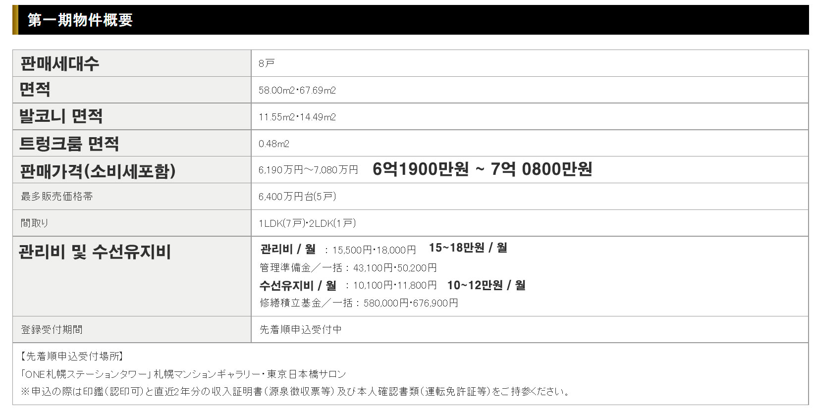 삿포로역과 지하로 연결이 되어 있는 타워맨션으로 초고속열차인 신칸센이 삿포로까지 연결된다는 소식에 삿포로의 부동산이 급등하고 있습니다.