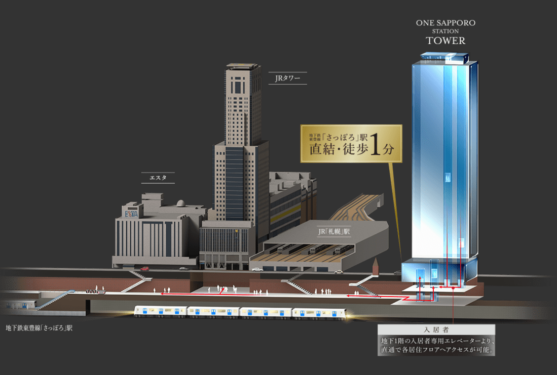 삿포로역과 지하로 연결된 지상 48층의 초고층 타워맨션이 화제가 되고 있습니다.
