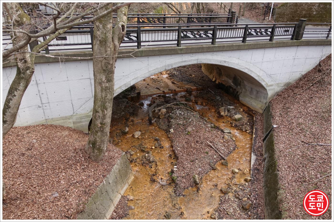 황금색(갈색) 온천수가 그냥 이렇게 흘러내려가고 있습니다.