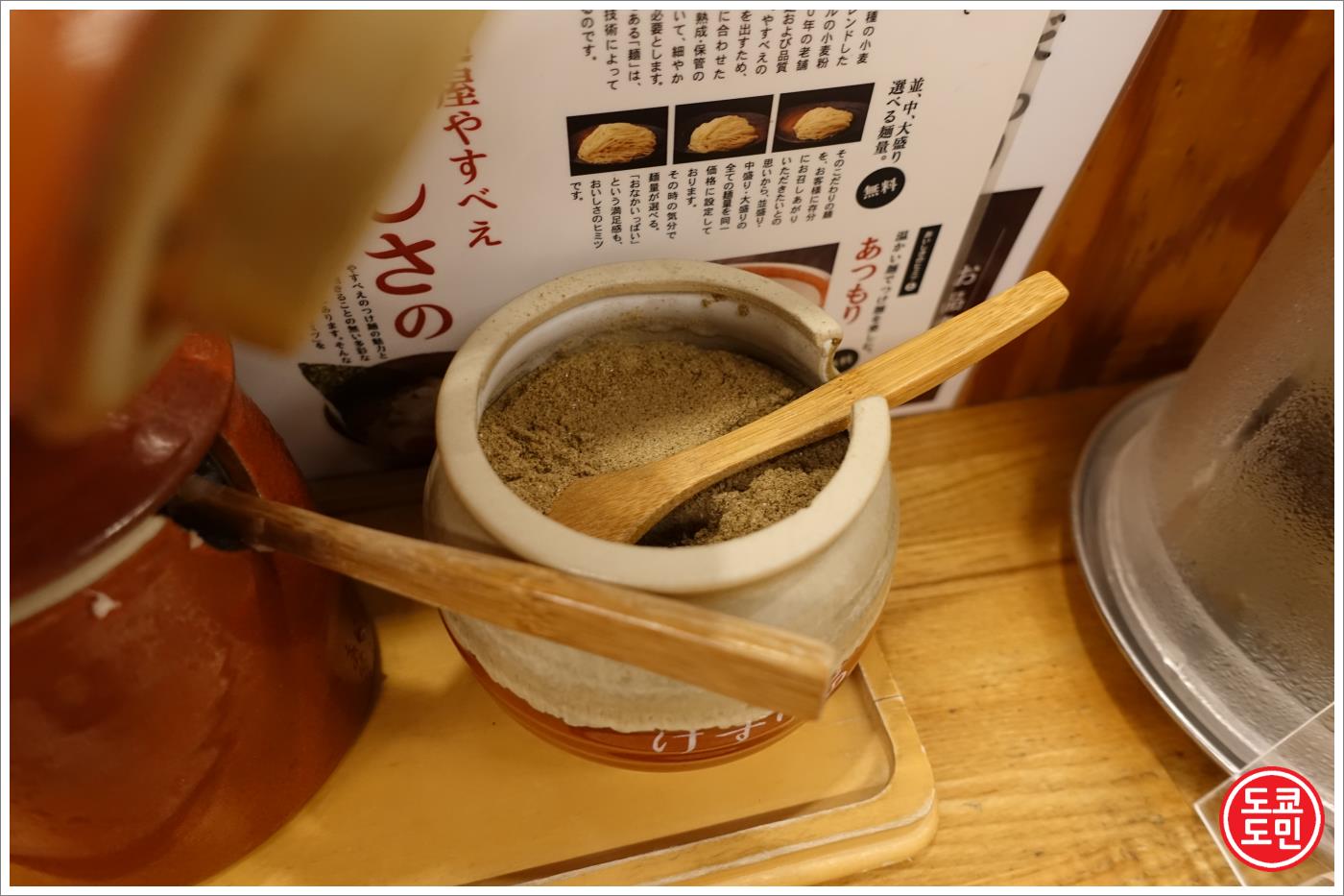 조금전에 항아리에 들어있는 생선가루를 이렇게 면에 뿌려서 드시면 됩니다.