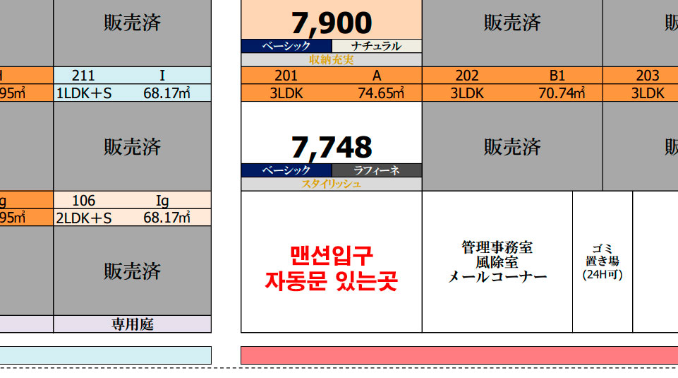 도쿄 네리마구라는 외곽쪽에 어느 맨션의 가격표입니다. (2022년 기준)