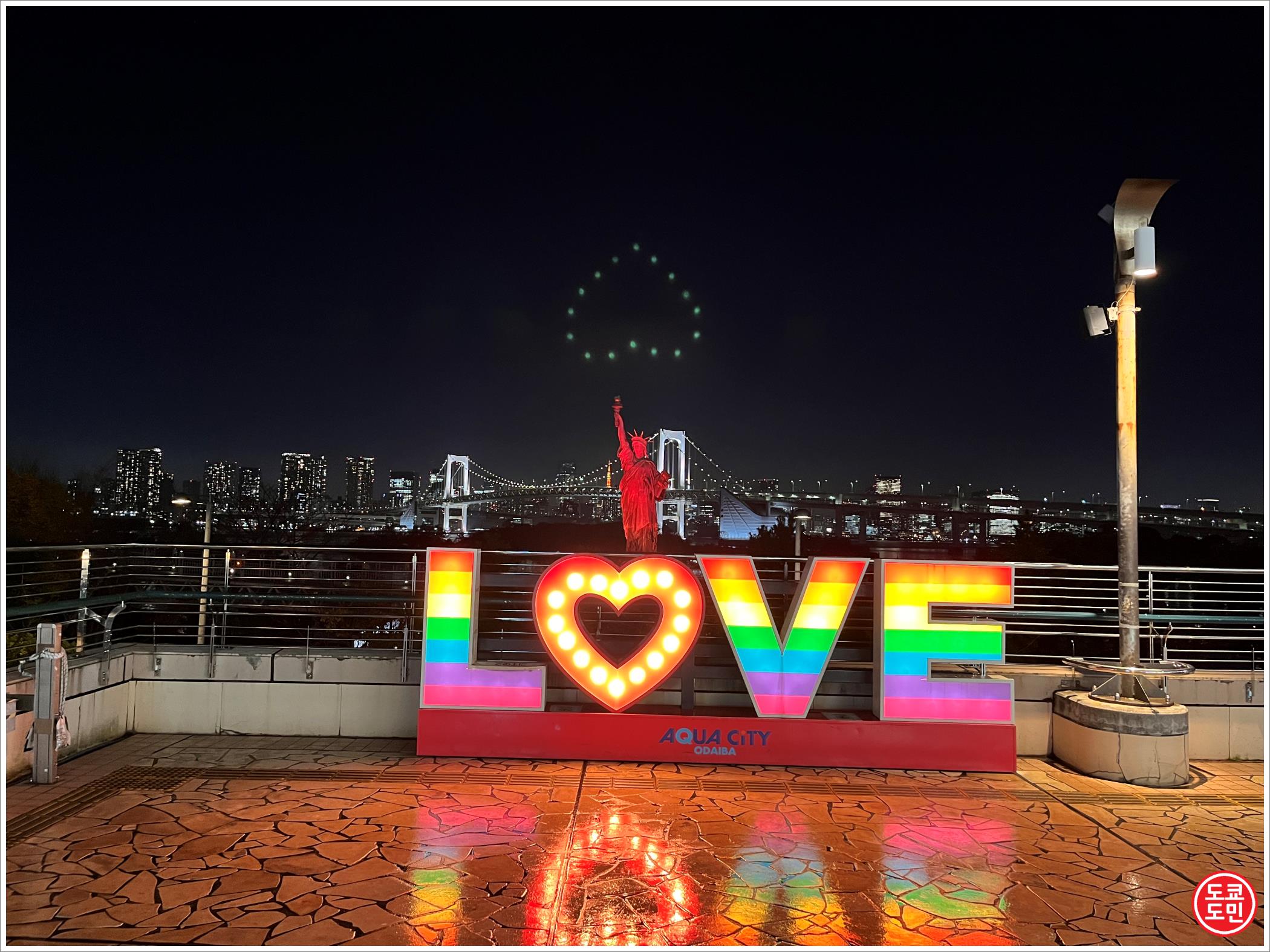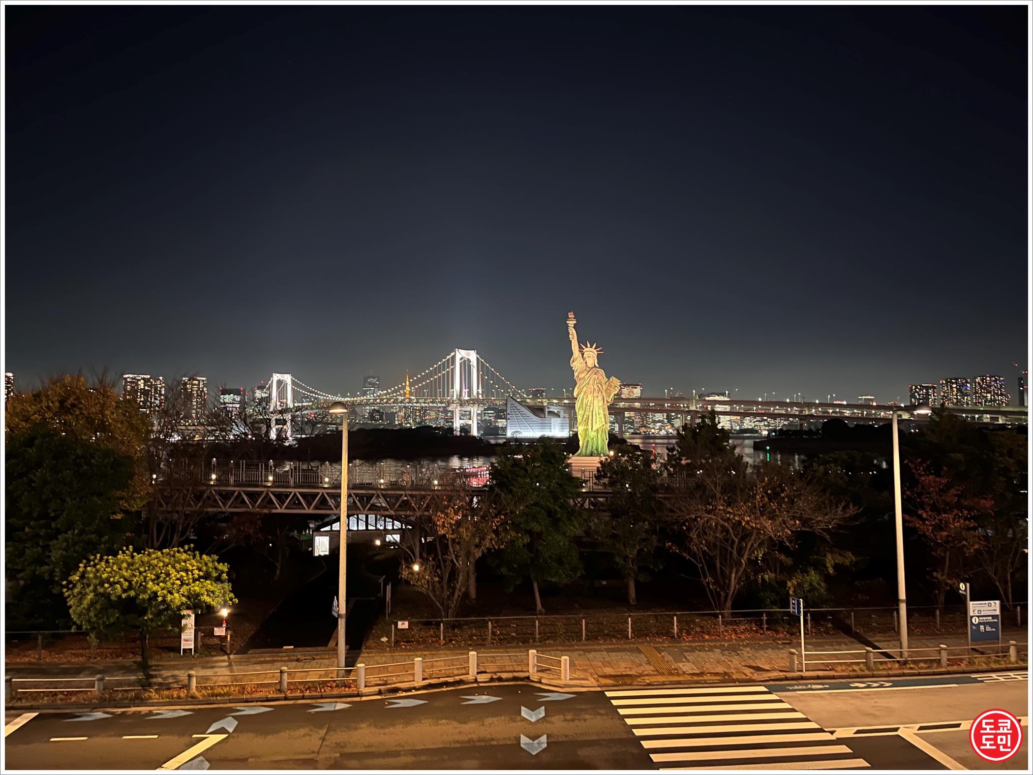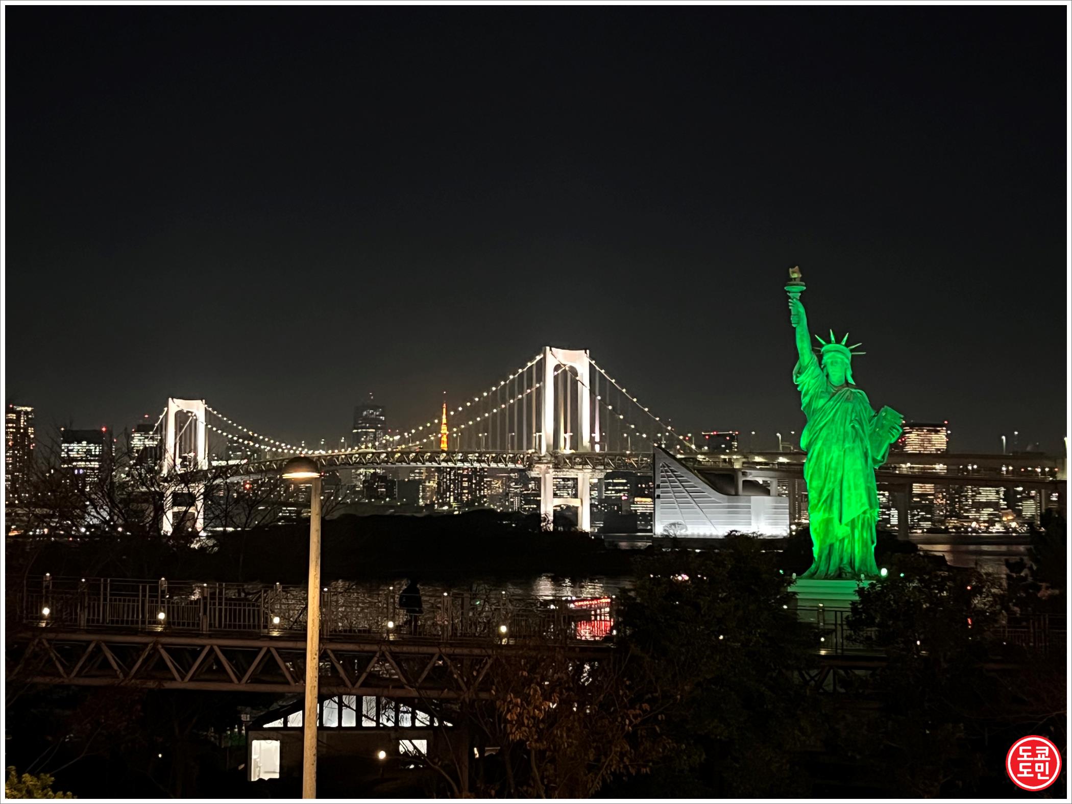 오다이바에는 레인보우 브릿지를 향해 자유의 여신의 복제품이 서 있습니다.