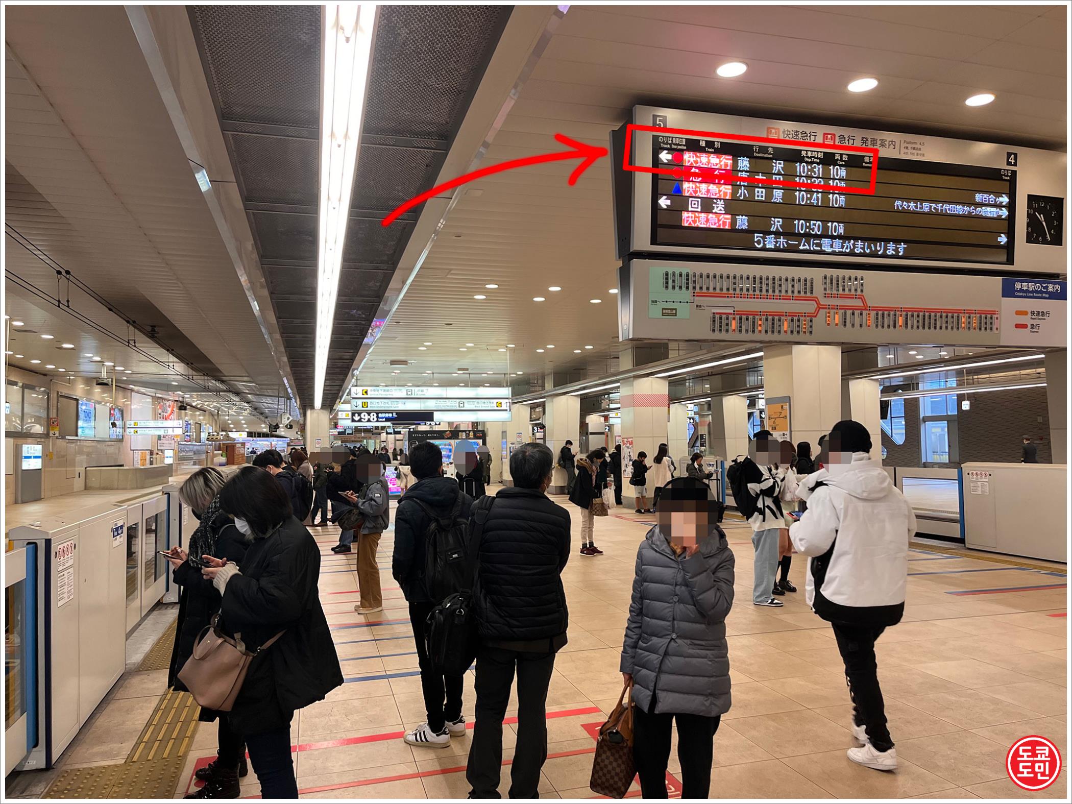 신주쿠역 오다큐선에서 "快速急行 藤沢(쾌속급행 후지사와)" 로 가는 전철을 타야합니다.