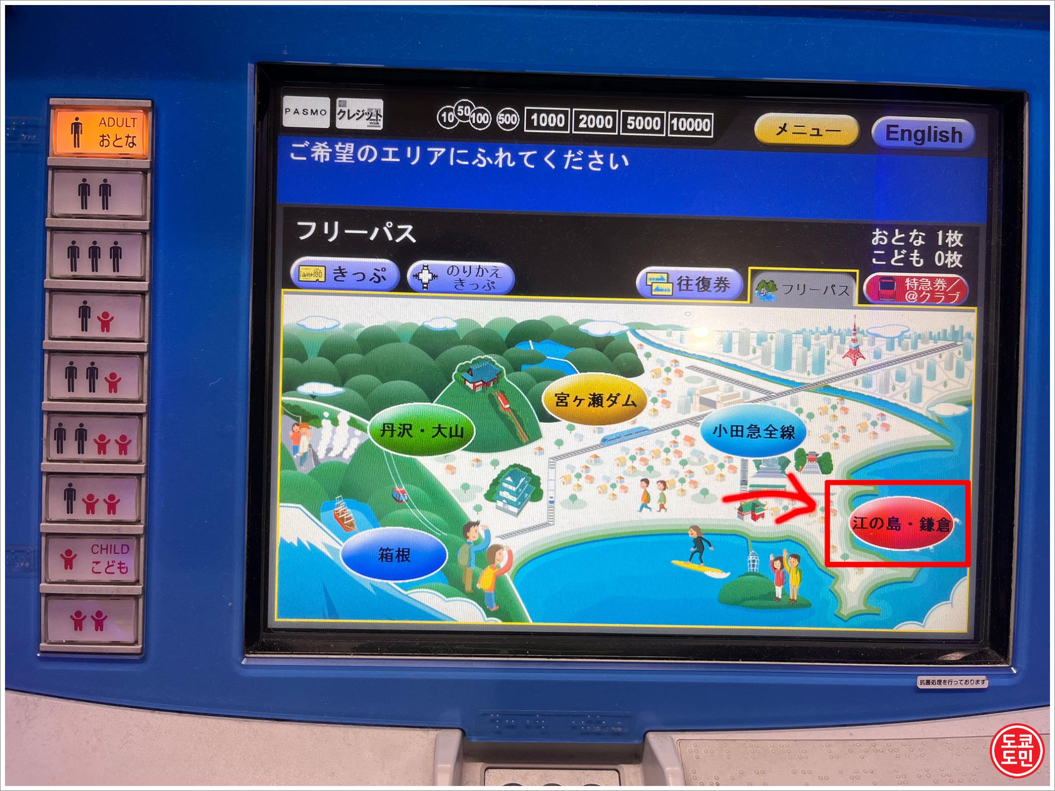 오다큐선 티켓 판매소(小田急線きっぷうりば) 에 있는 티켓 발매기를 이용해서 에노시마, 카마쿠라 프리패스를 구입합니다.