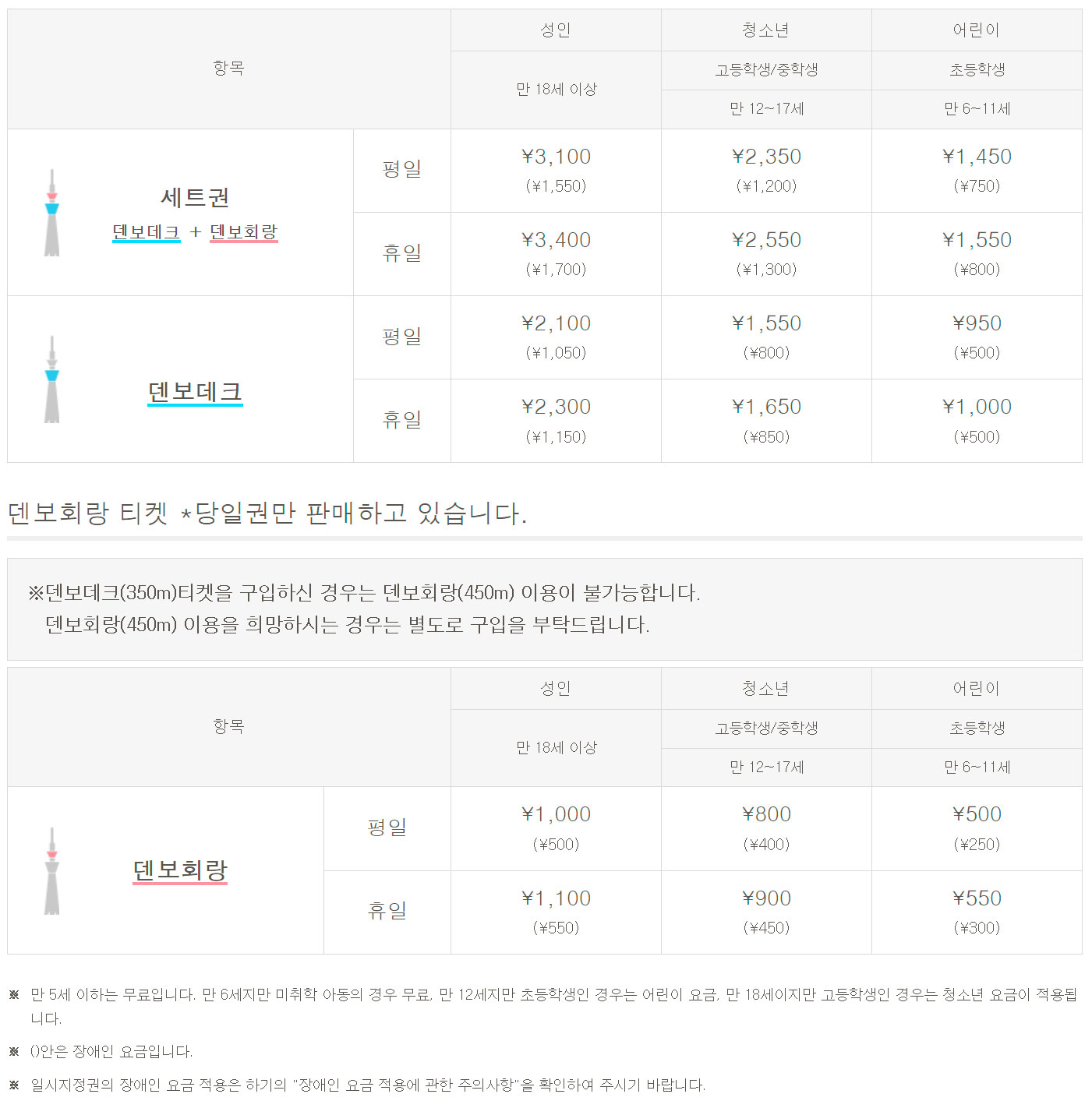 덴보데크 + 덴보회랑의 경우 평일, 2700엔, 주말 3000엔.